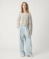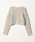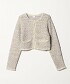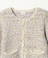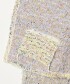 此款針織開襟衫採用羊駝混紡紗線與緞帶紗線各三種色彩,透過緹花編織工藝,呈現出豐富的混色層次感,宛如一件精緻的外套。