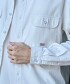 〇 側邊拼接異材質與品牌Logo鈕扣等,處處展現對細節的講究