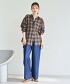 牛仔褲版型寬鬆,褲管些微繭型設計增加造型感,長度偏長身高較小的女孩可將褲管反摺穿著。