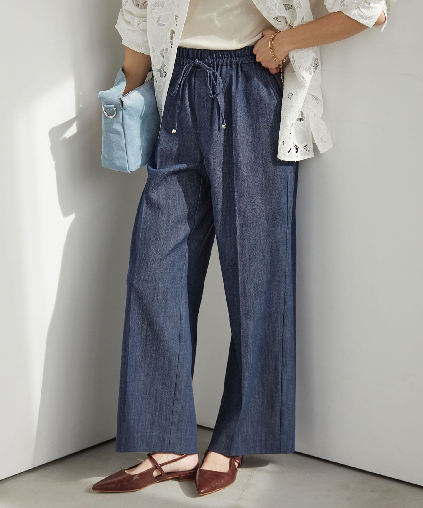 牛仔布,但比一般牛仔褲還有彈性,腰部鬆緊帶穿脫舒適。褲寬直筒版型。