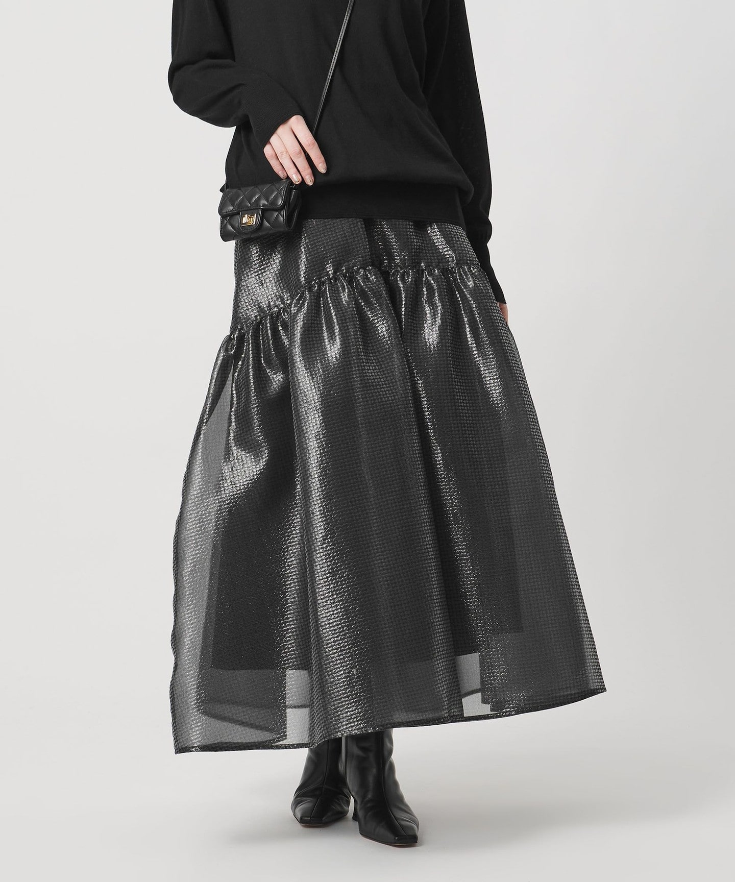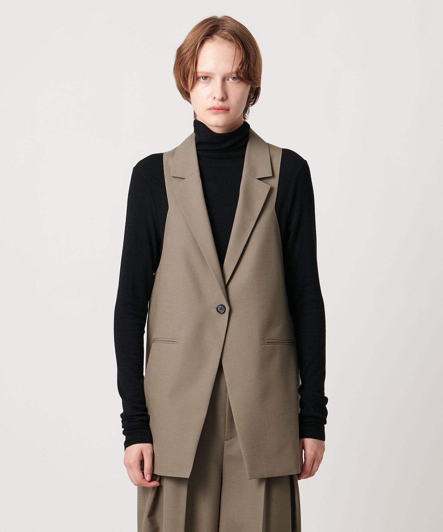合肩無領,下襬偏寬散狀,像裙子的風格。因為無領,建議穿著高領或是以絲巾搭配。