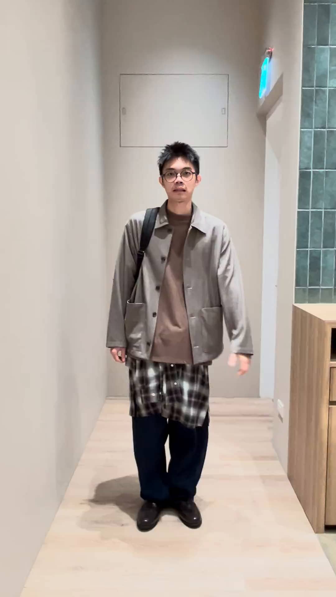整體咖啡色做貫穿,外套的千鳥格跟襯衫格紋呼應,有細節有層次的穿搭