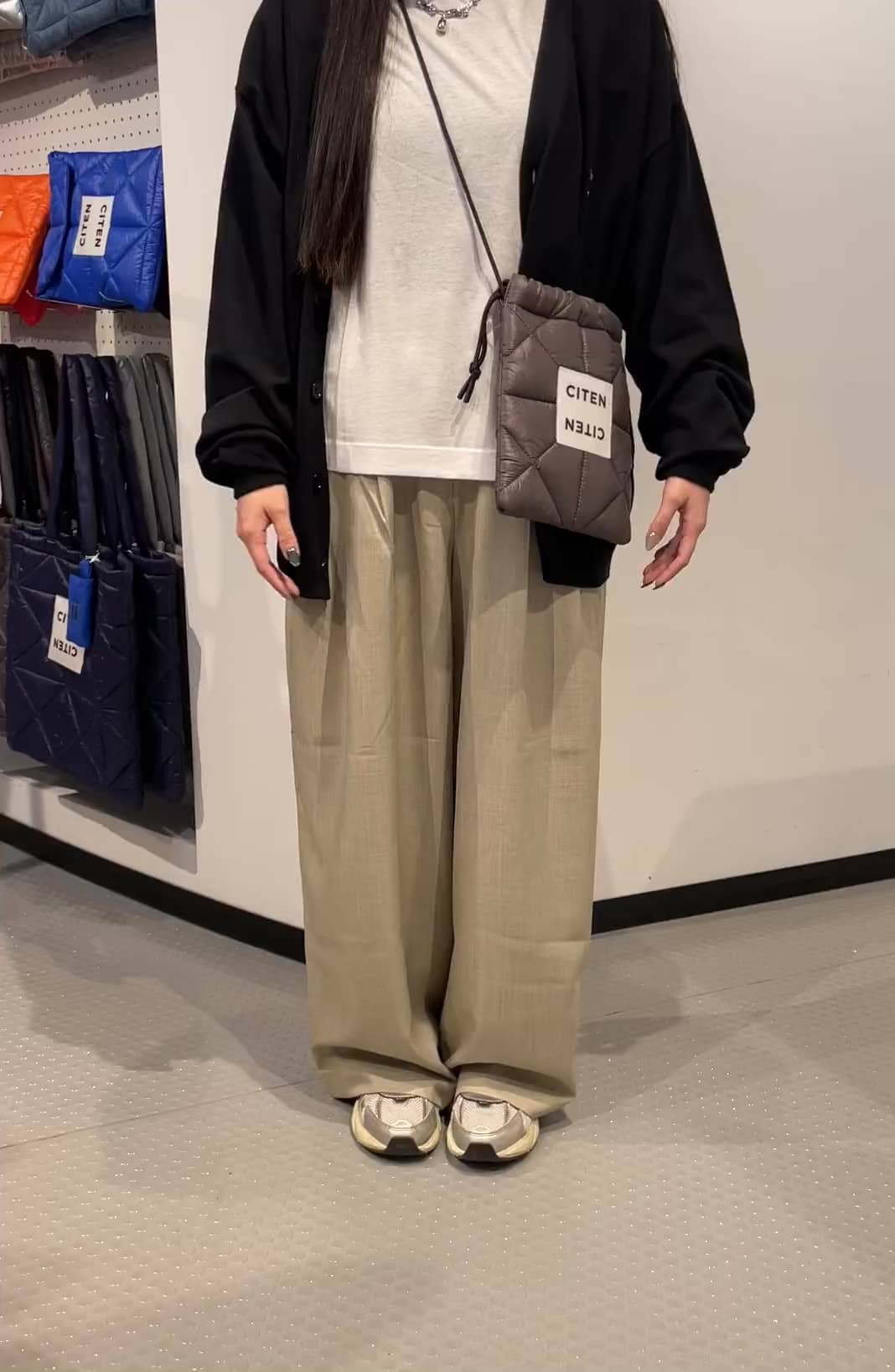 內搭白T與米色寬褲打造輕鬆基底,外搭黑色開襟外套增添俐落感,小斜背包點綴,整體簡單卻不單調。
