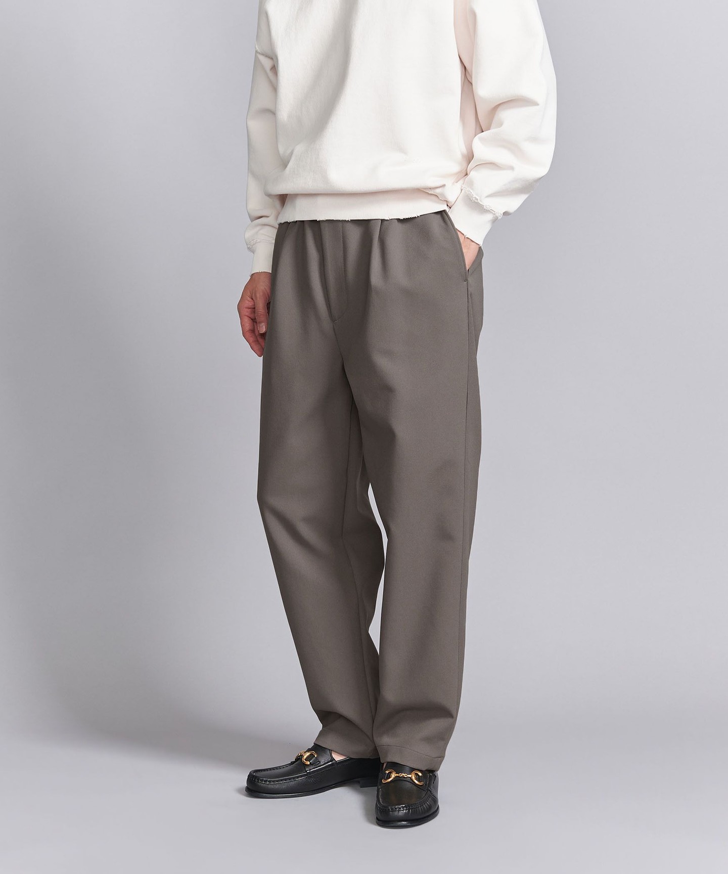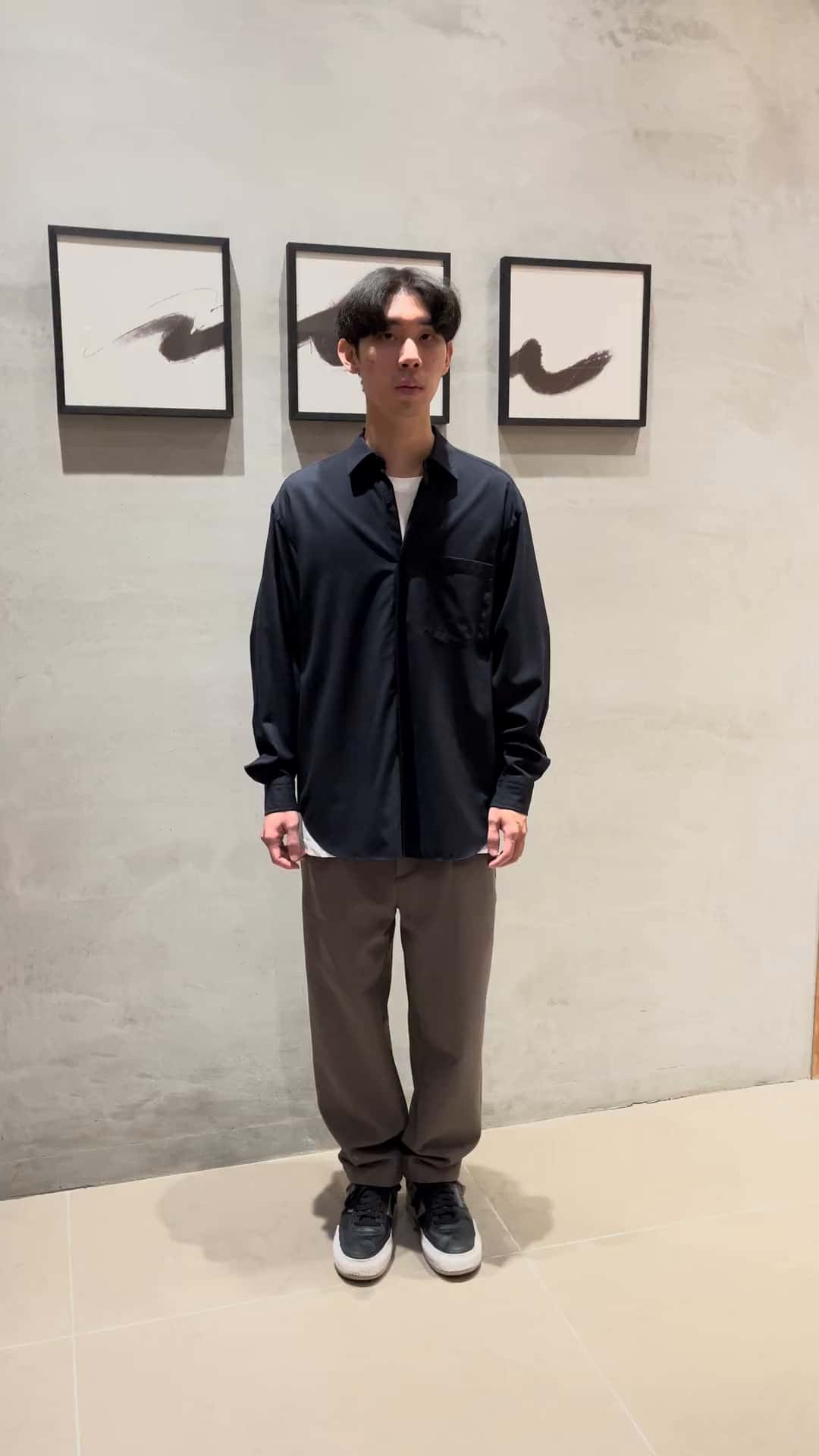 上身使用羊毛材質的襯衫做搭配,帶有些微亮面感,下身則使用具有一定厚度的輕便褲做搭配,上深下淺讓整體富有高級感,同時給人一種溫和且沉穩的感覺