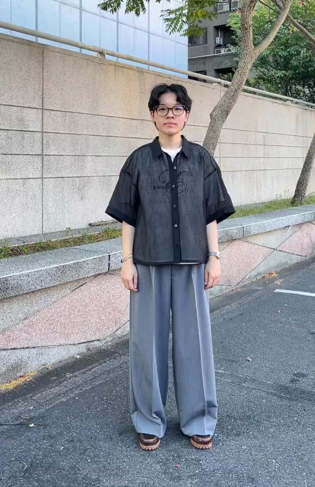 版型合身的T恤外搭皺摺細節的透膚襯衫,使兩樣單品更能展現出特色,內裏改搭背心可以呈現不一樣的風格,下身穿著寬鬆輪廓的褲型,俐落的打褶線條帶有正式感,讓整體不會過於休閒