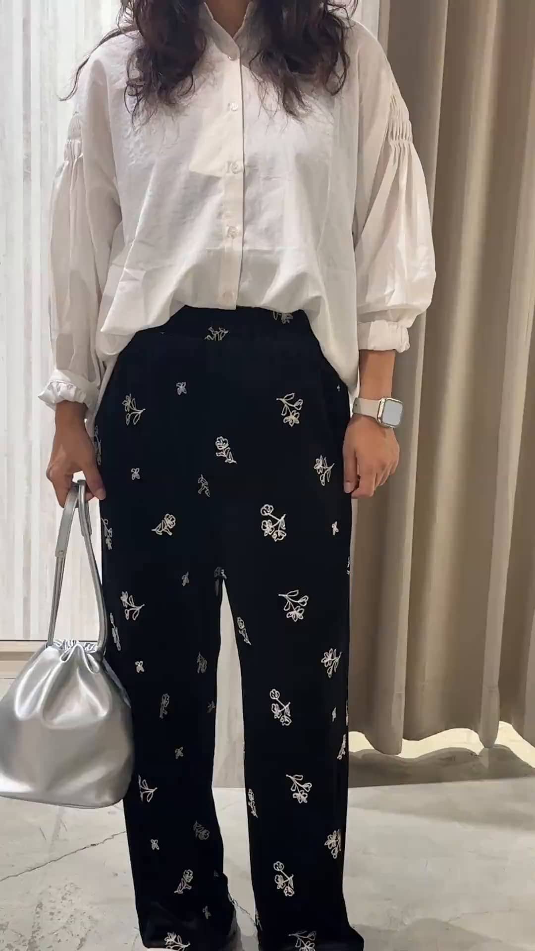 襯衫手臂及後背有皺摺設計,寬鬆剪裁,上班或休閒都能穿褲子花朵刺繡增添可愛感,版型穿起來也很修飾~