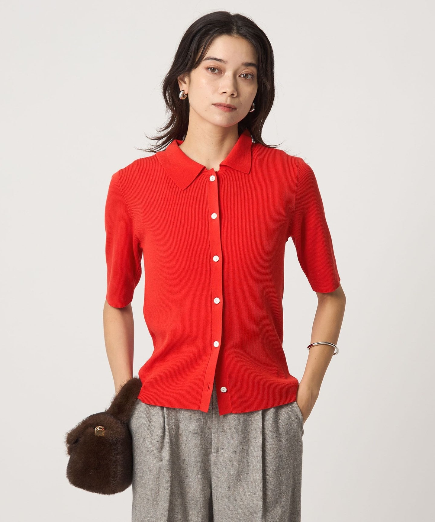 飽和的紅色開領針織衫彈性好可搭配寬版丹寧褲