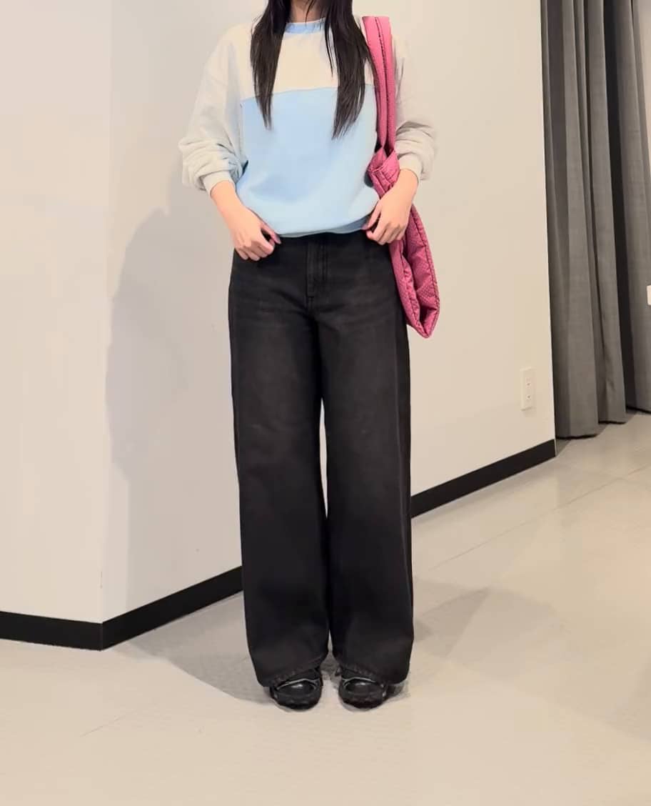 灰藍拼接的棉質衛衣,帶一點運動感的柔軟觸感,下身是偏厚磅的黑色寬版牛仔,挺度剛好,用亮粉色包提亮整體色調,讓休閒穿搭不會太平淡。
