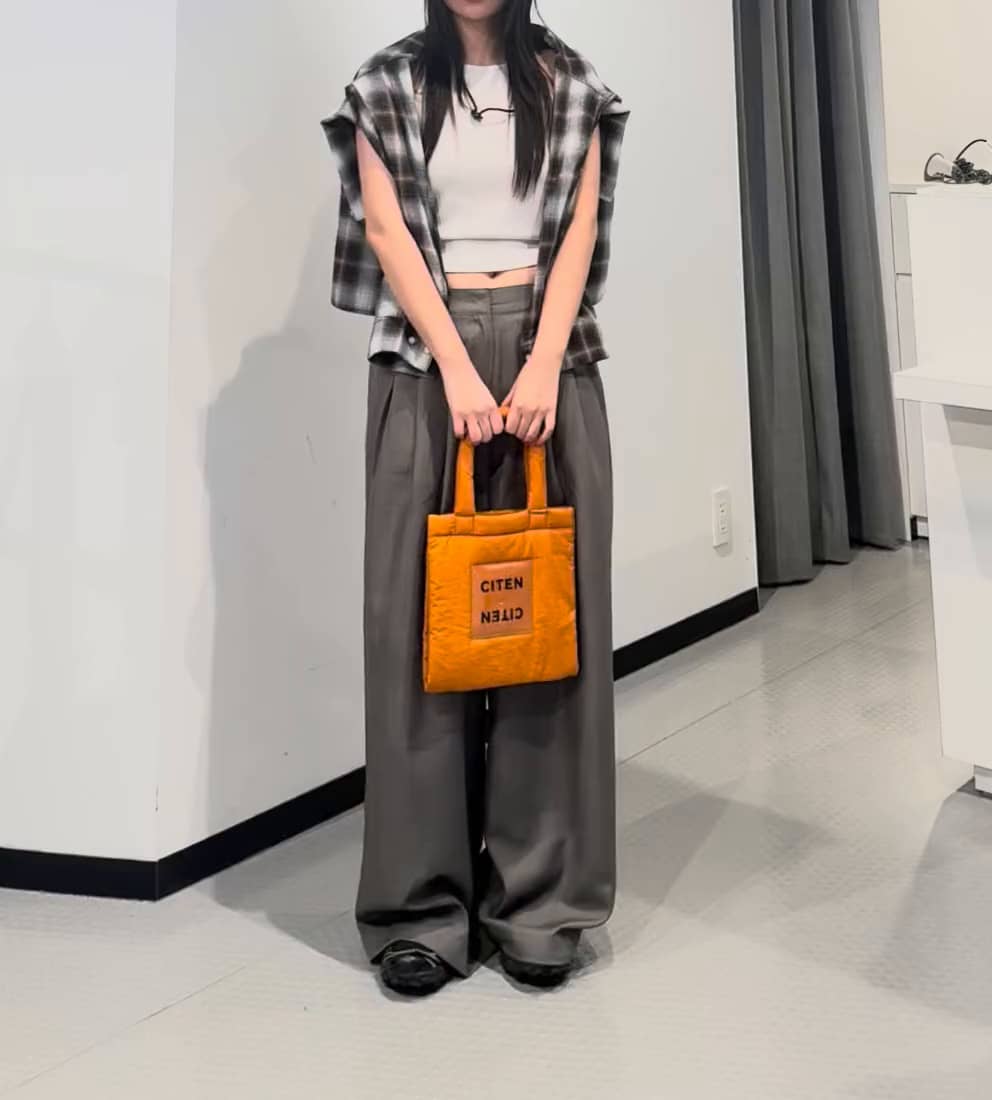 柔軟棉質的格紋襯衫隨性披上肩加上鴨舌帽營造輕鬆小搭配,短版背心與灰色西裝寬褲,再搭上一個亮眼的橘色小包