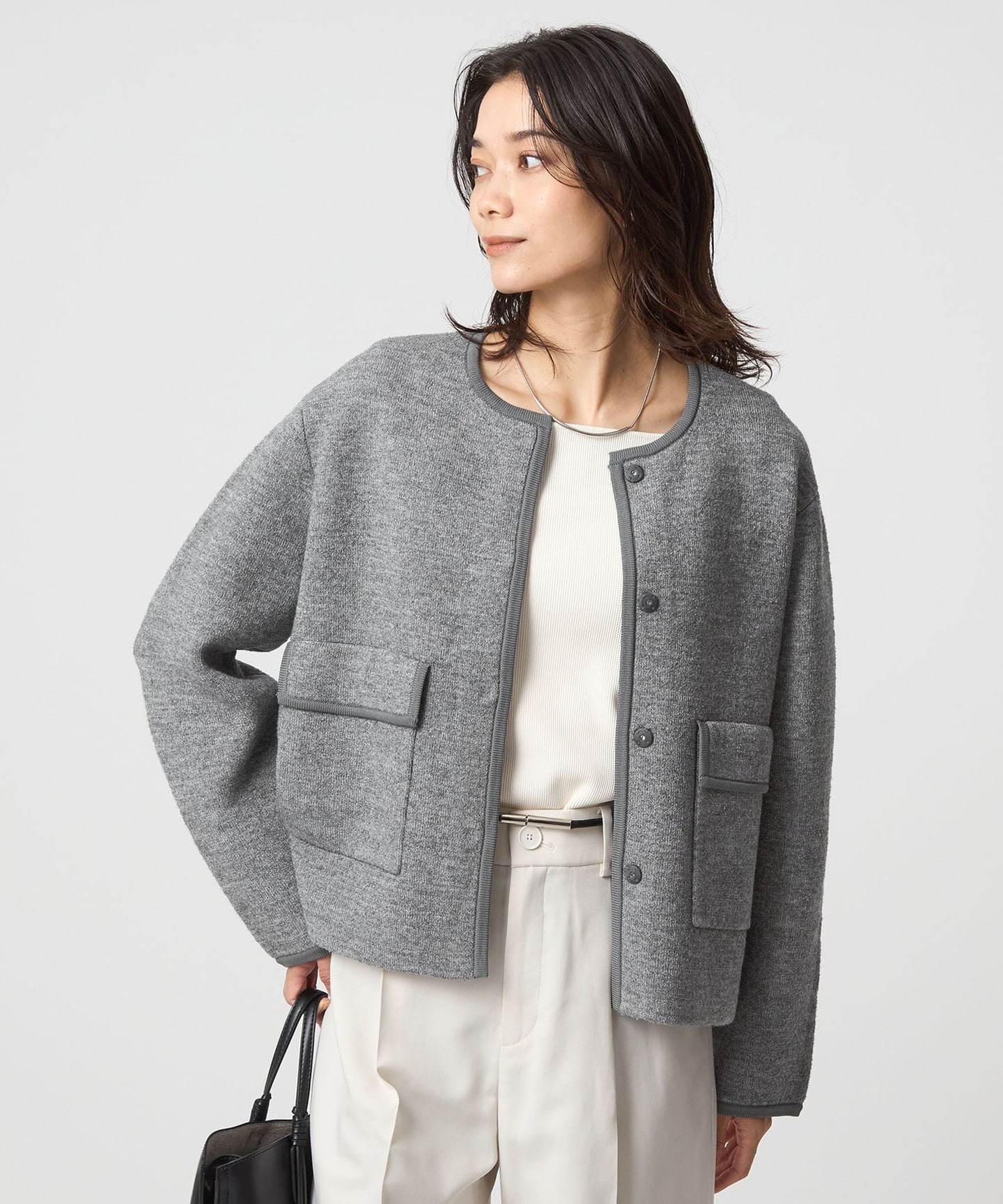 鑲邊無領針織外套