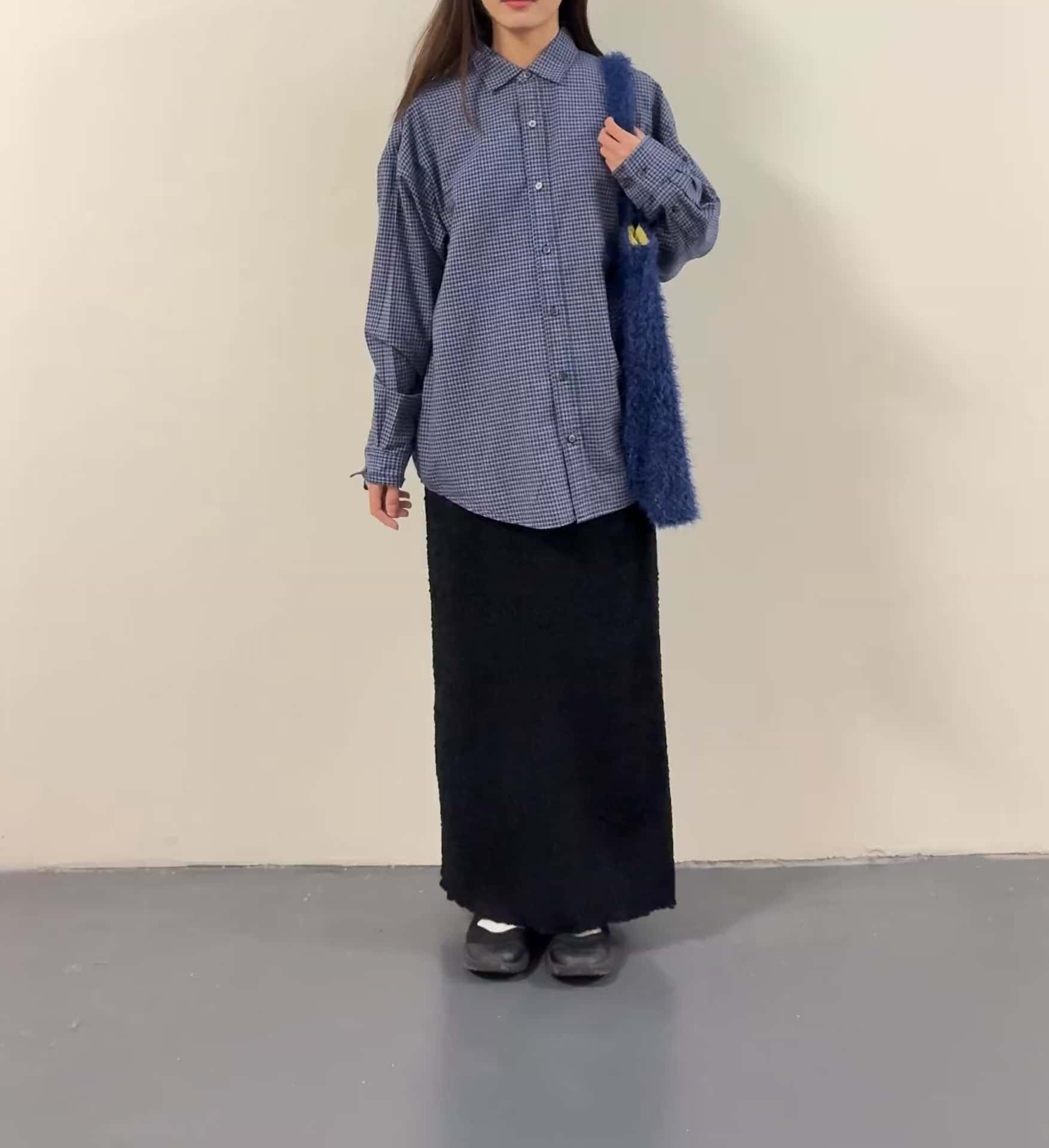 溫柔長裙配格子襯衫,再搭配毛毛跳色包包又多了一點可愛俏皮