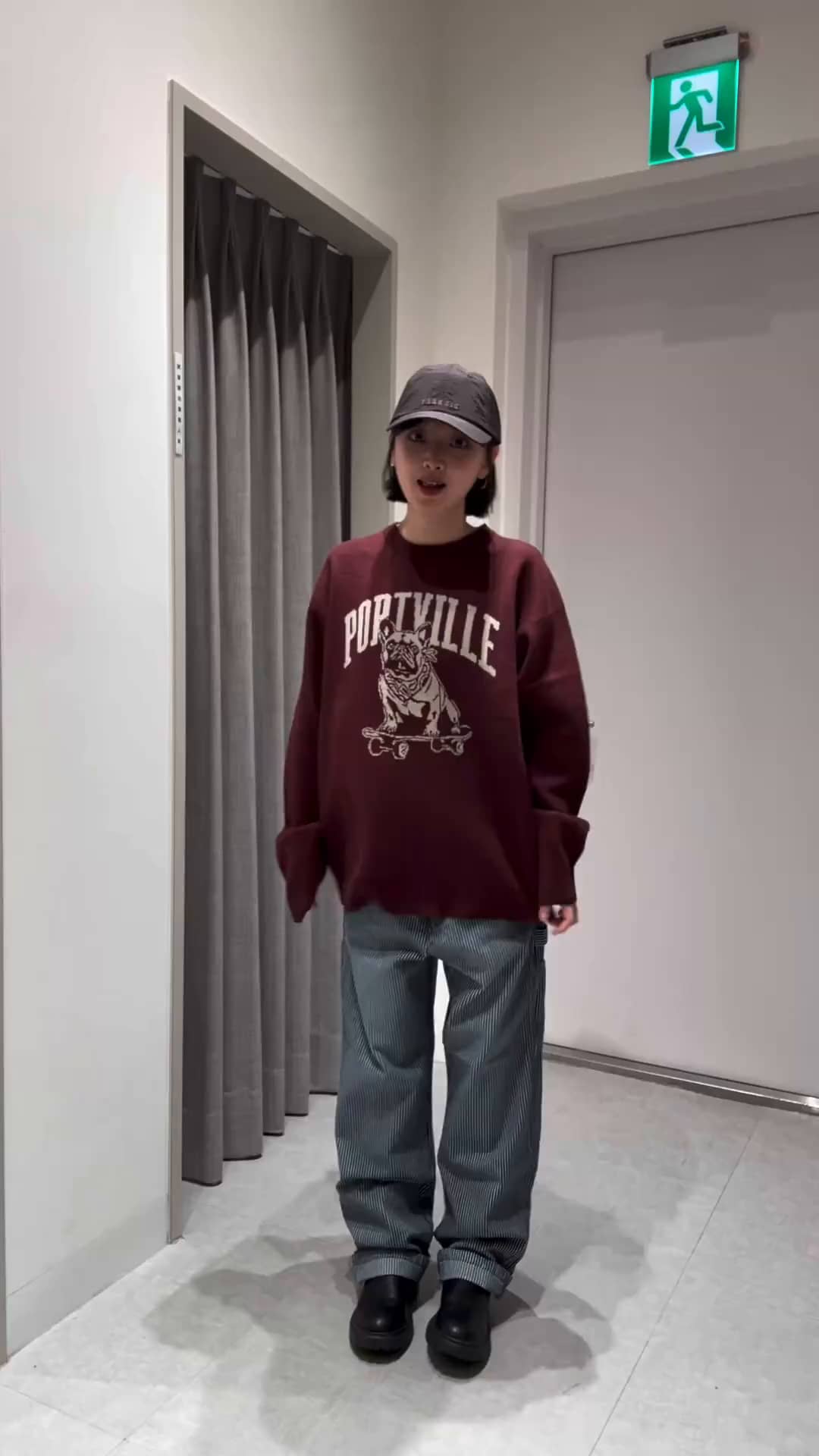 休閒率性風,酒紅衛衣配寬鬆條紋褲,搭棒球帽,簡約又有街頭感。