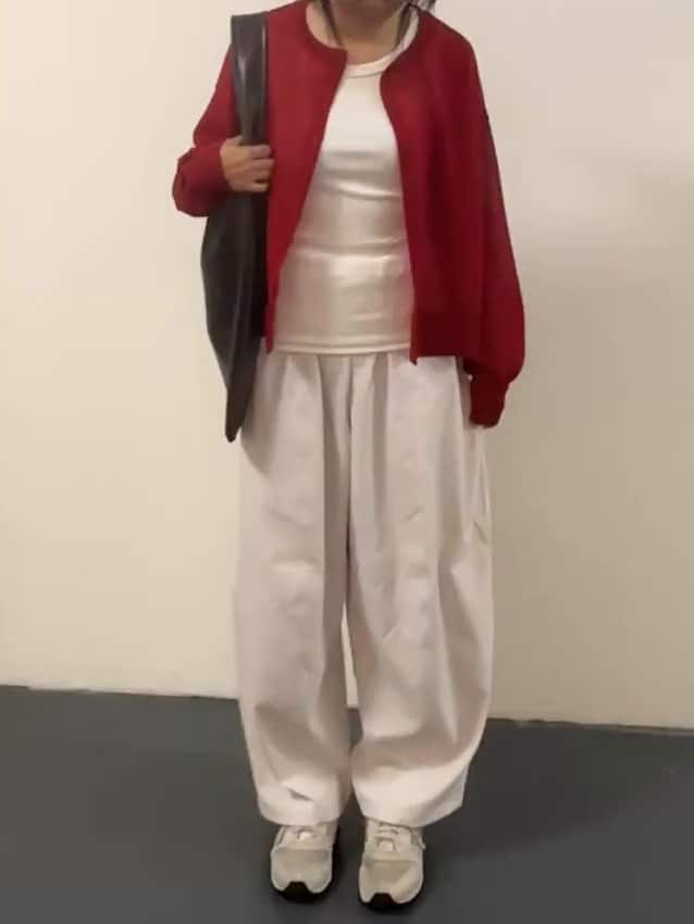 紅色針織開襟外套搭配上白色內搭上衣與白色休閒褲,中和了紅色的強烈感,也讓整體看起來清爽乾淨,為經典的耐看組合!