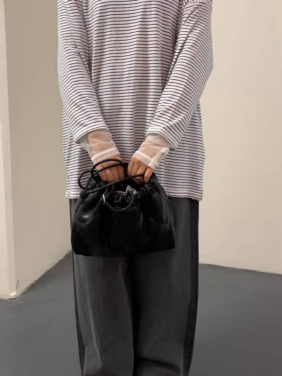 上衣長袖T設計經典的黑白細條紋,版型寬鬆肩線順滑,下身深灰牛仔寬褲,顏色比典型牛仔褲更沈穩,形成中性氛圍,與上身的淺灰形成輕微對比,寬褲的輪廓呼應上身的寬鬆線條,整體很有順眼的垂墜感,讓人看起來很自在。