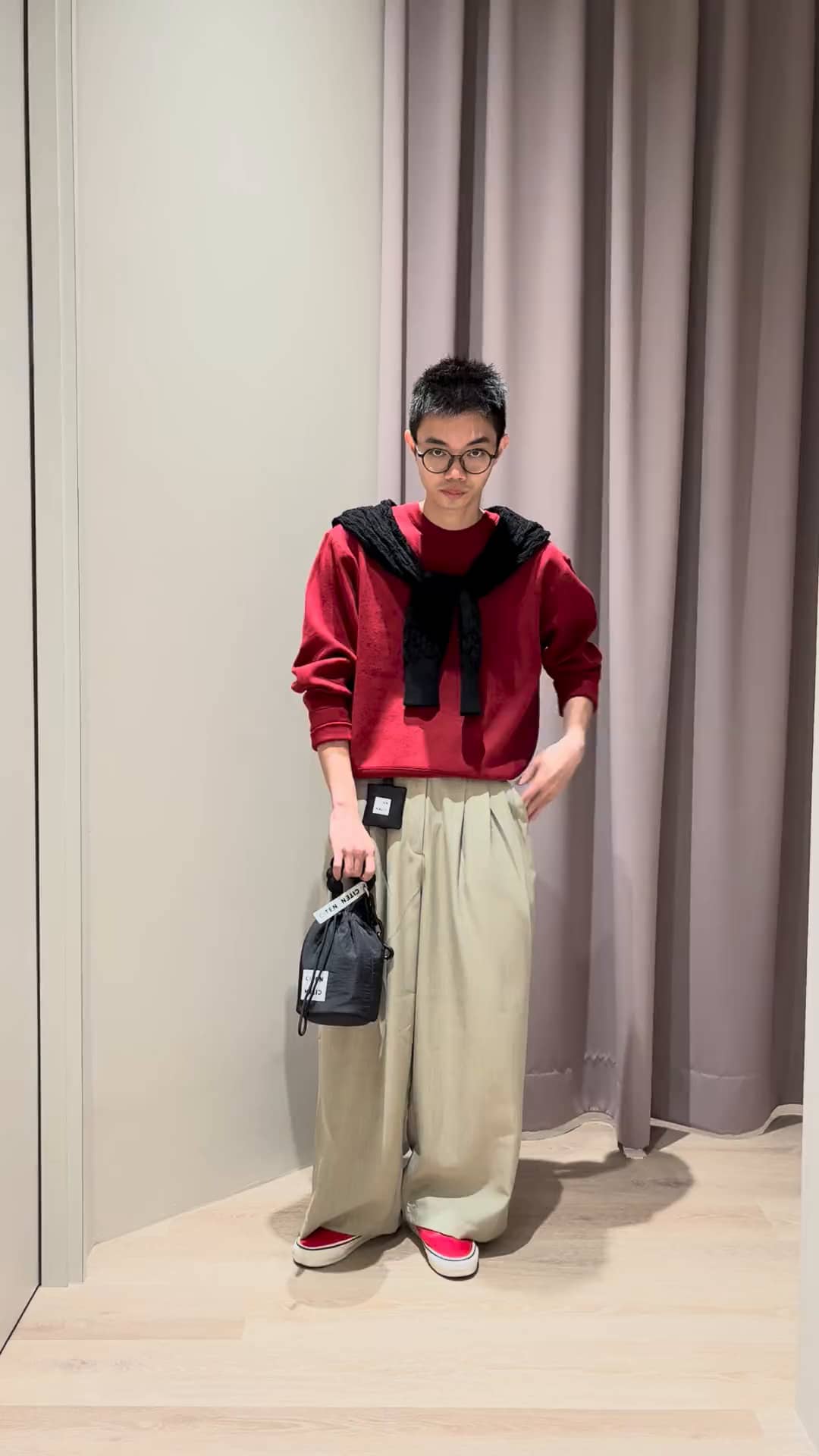 這套紅色搭配卡其寬褲,寬短的設計,男生穿起來也很有型,外綁一件針織衫、小包、吊飾,增加層次👍👍