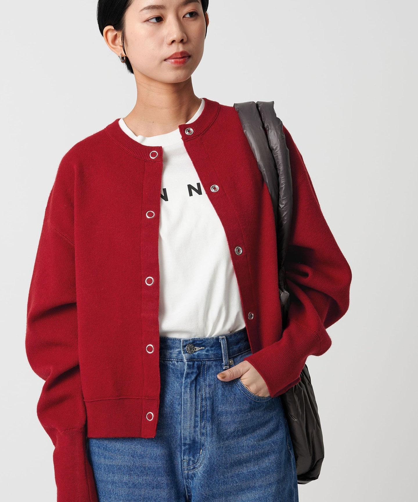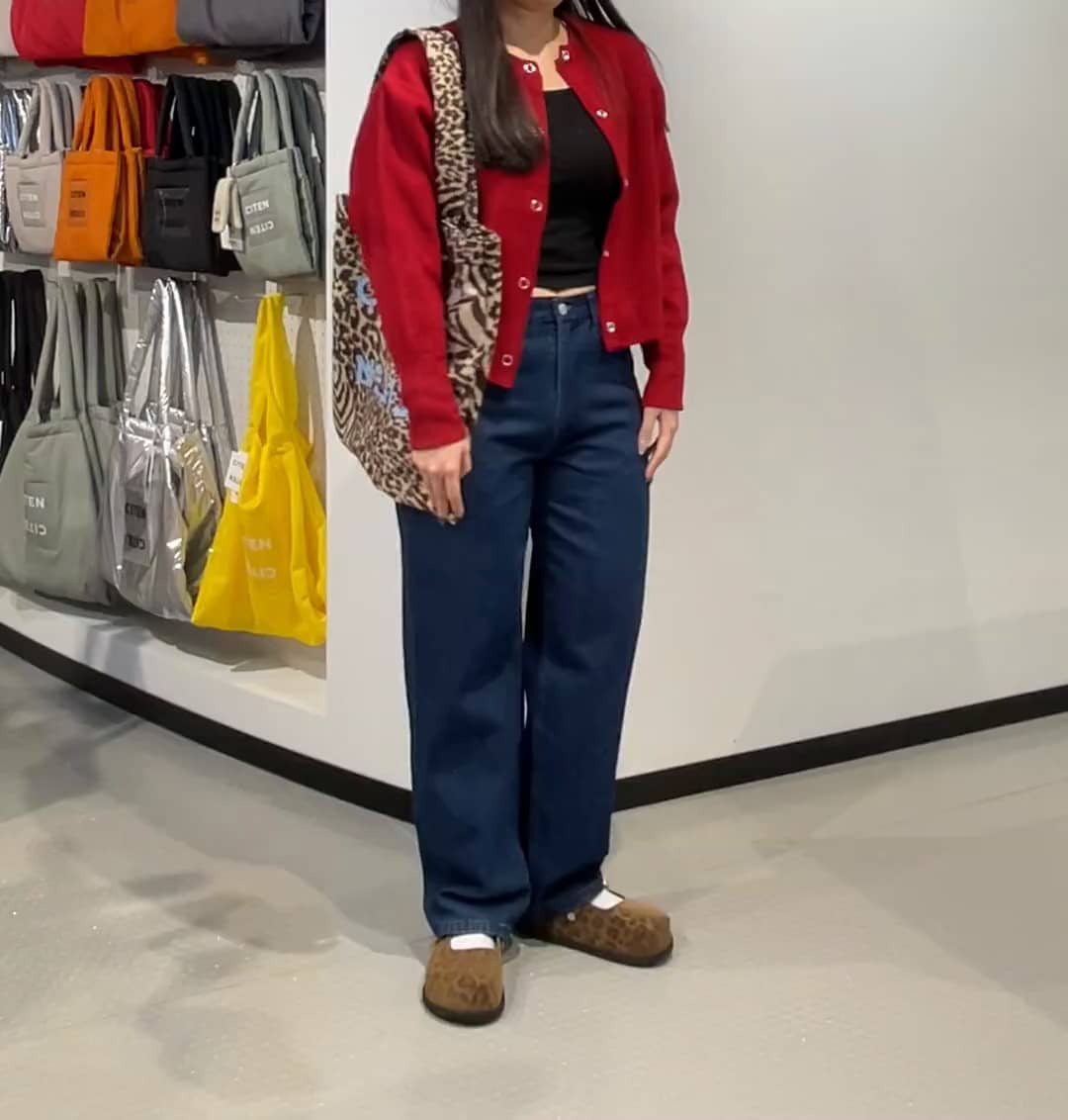 紅針織外套配上深藍牛仔褲增添復古氣息,豹紋包包與紅色外套的暖色系呼應,讓造型更有個性與層次。