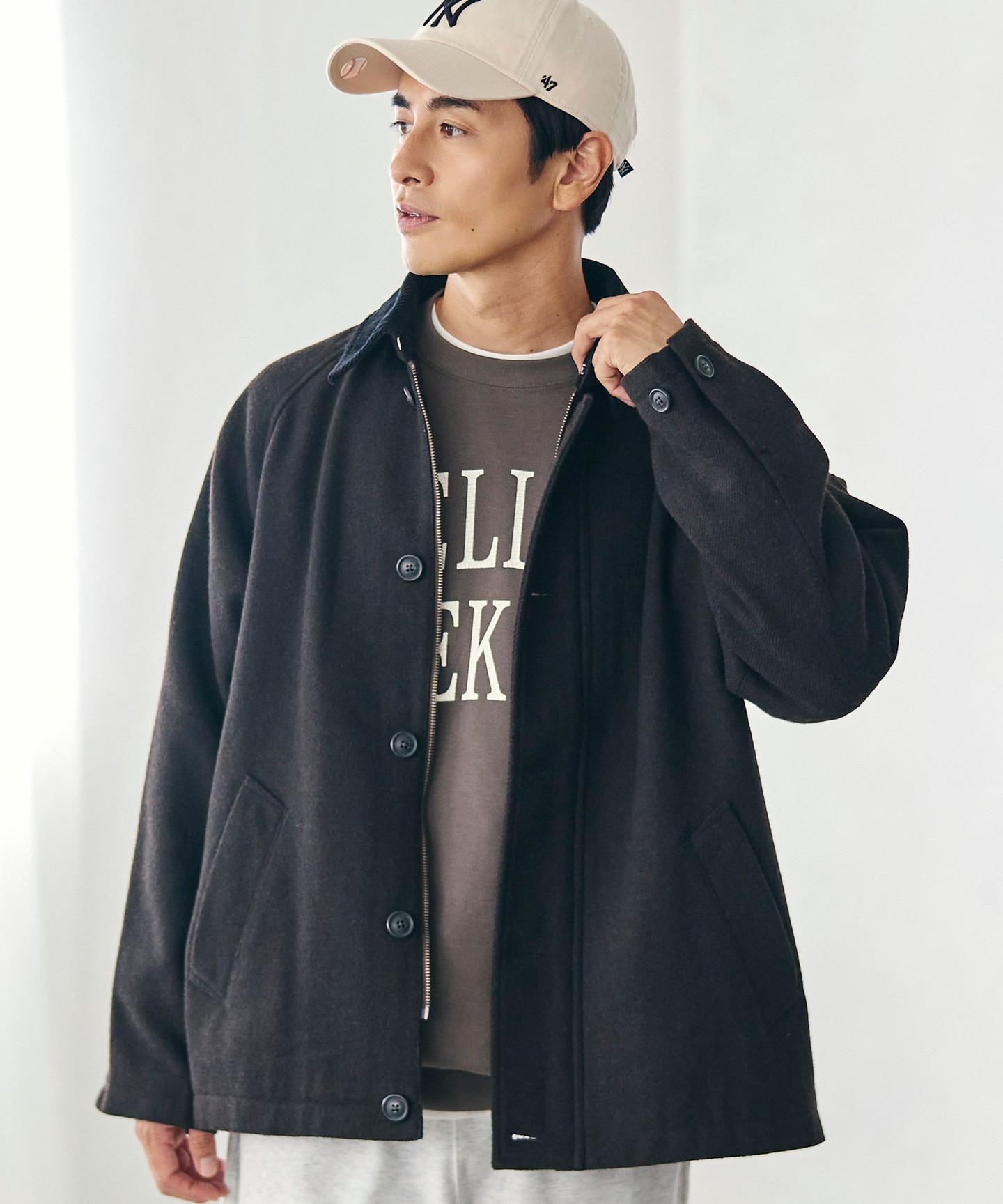 稍微復古的外套風格,搭配簡單顏色的內搭長袖,褲子就簡單修身。