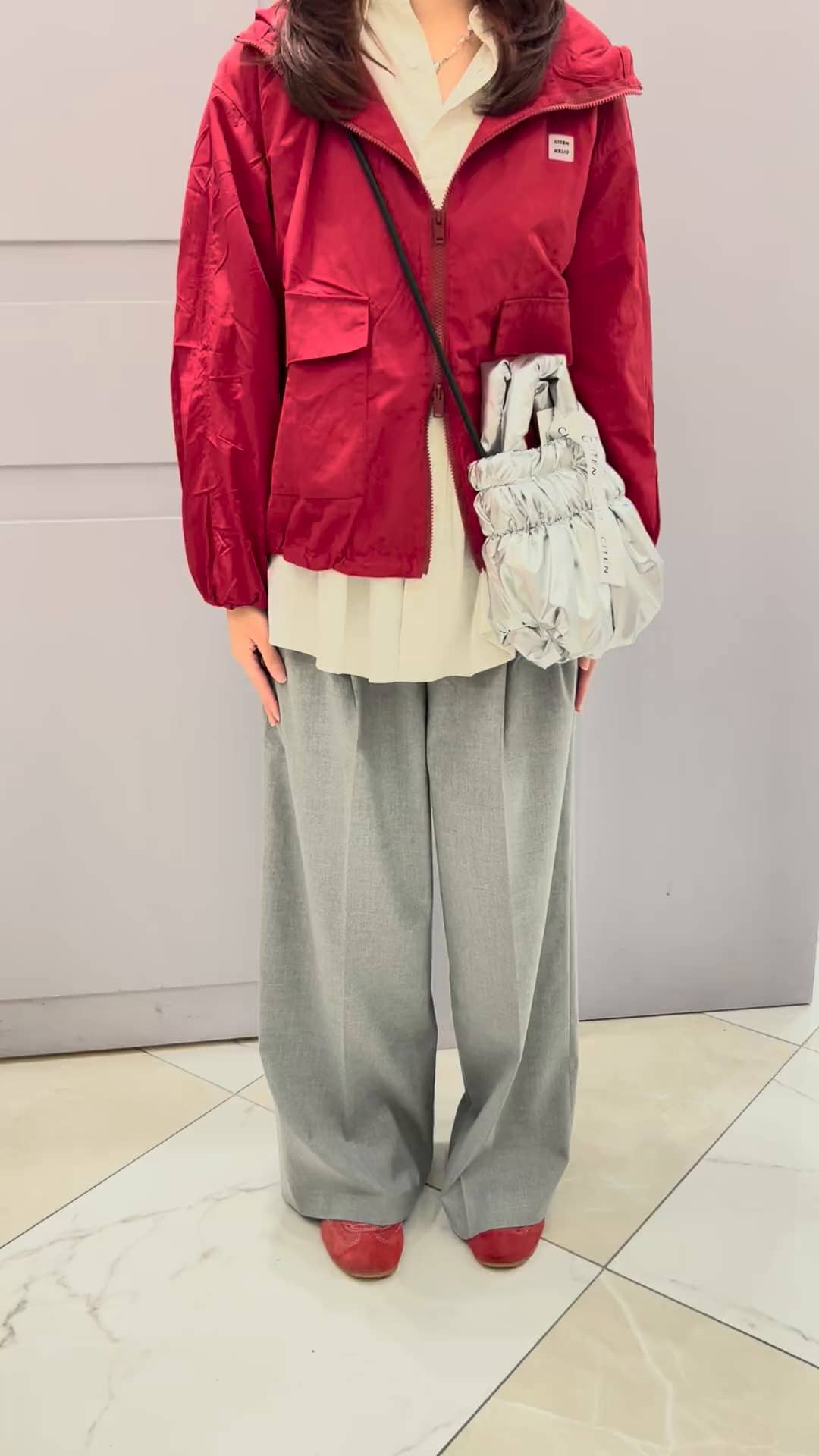 紅色尼龍外套搭配簡約的襯衫增加撞色穿搭層次,下身搭配俐落的西裝褲,西裝褲材質親膚穿起來垂墜感很好,不會讓下身過度正式