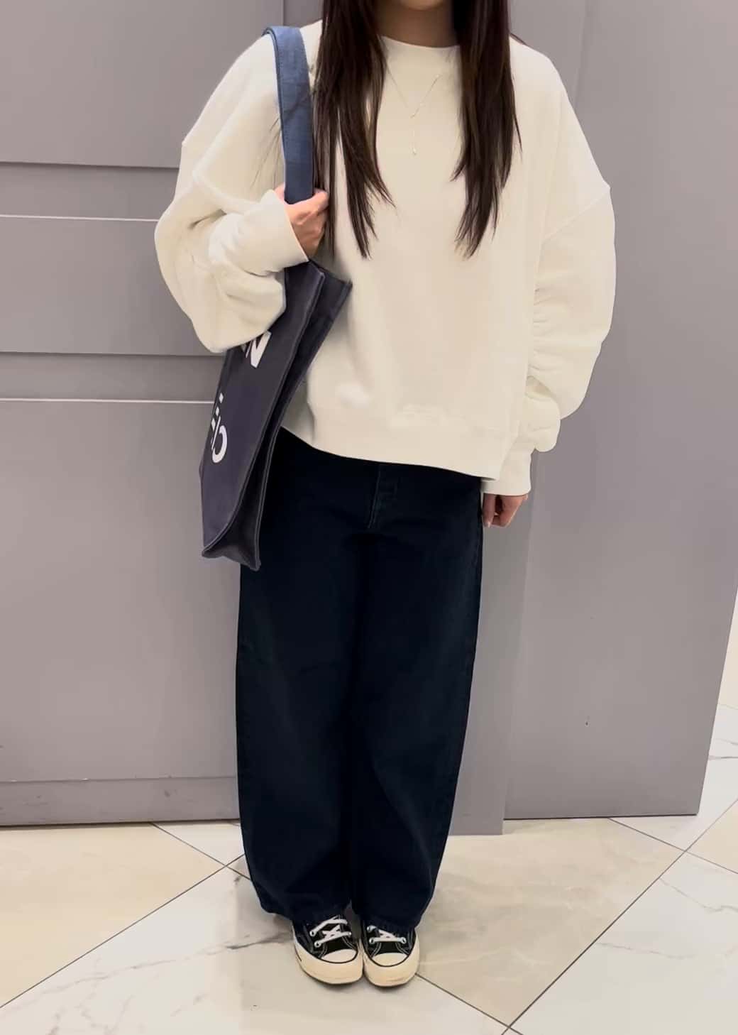 短版大學T穿起來俐落有精神,又帶著保暖感;搭配直筒牛仔褲簡單卻耐看,再揹上 LOGO 托特包,上班與通勤都很合適。