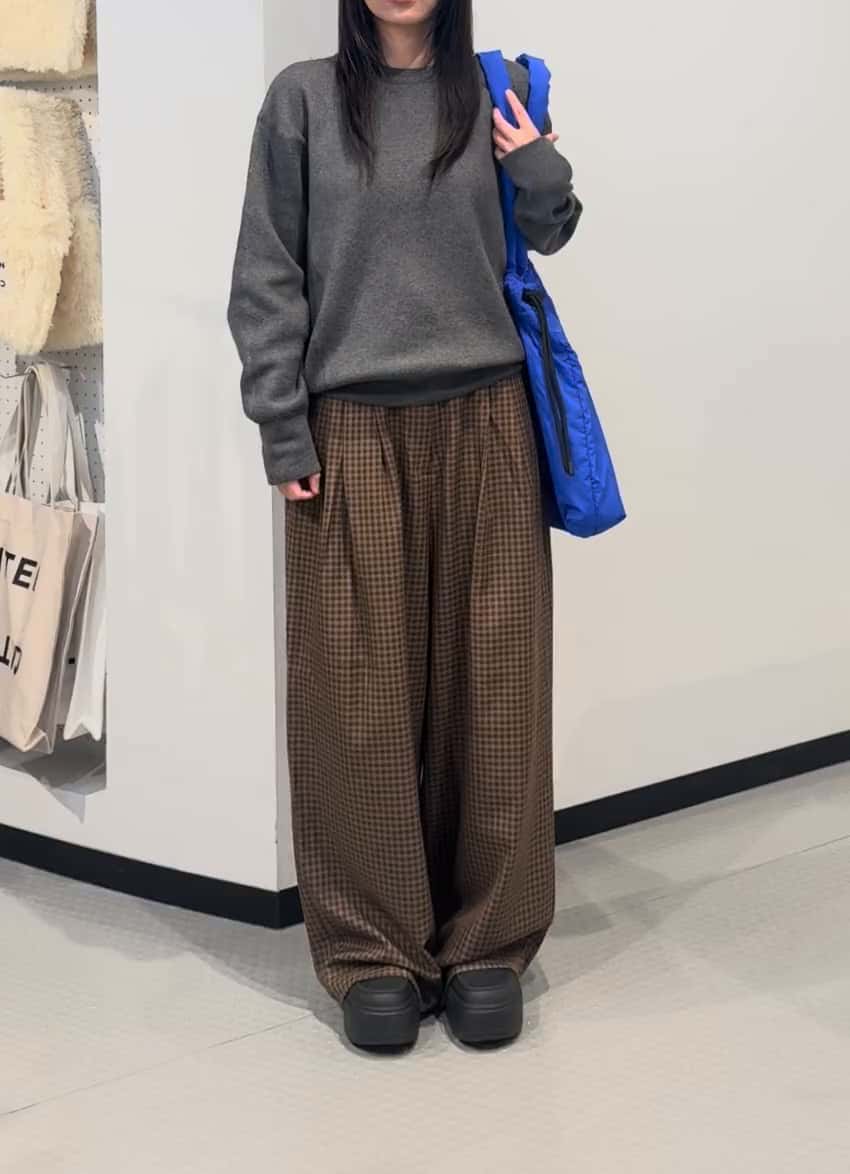 深灰毛衣的布料很軟,袖口自然蓬一點,看起來就很舒服,格紋寬褲有做出漂亮的摺線,走路會微微擺動,版型很加分,寶藍色包包當作整套的亮點