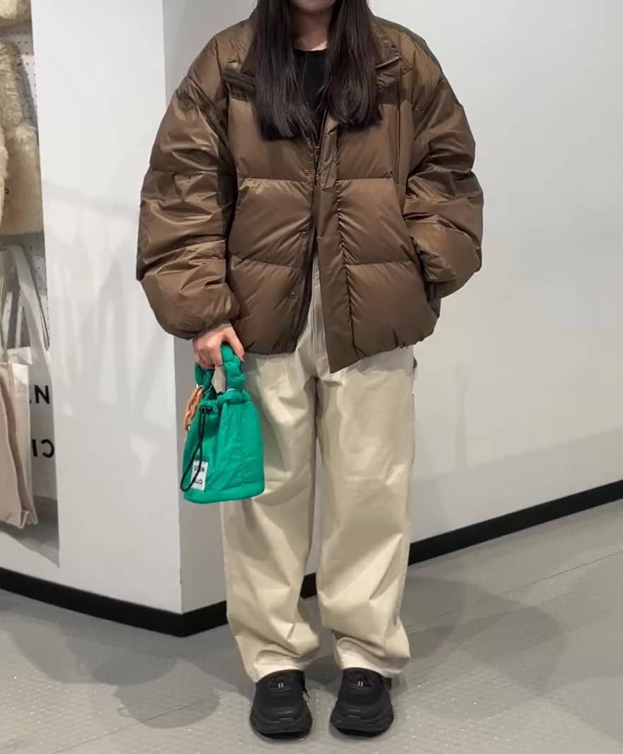摩卡棕羽絨外套蓬鬆份量感十足,穿起來非常保暖不厚重。