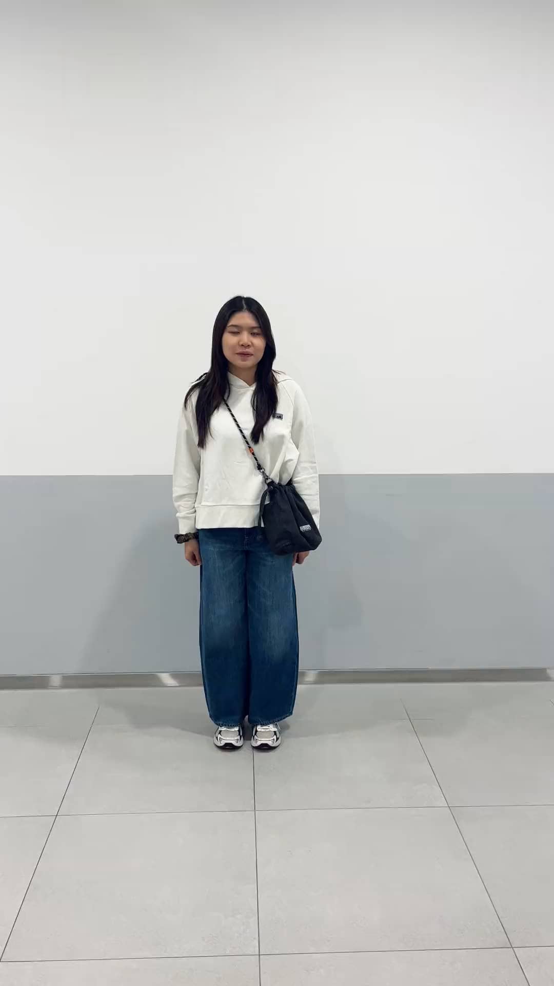 簡單的白色帽踢加上藍色牛仔褲再搭配一個束口袋包包,自然舒服又不顯邋遢