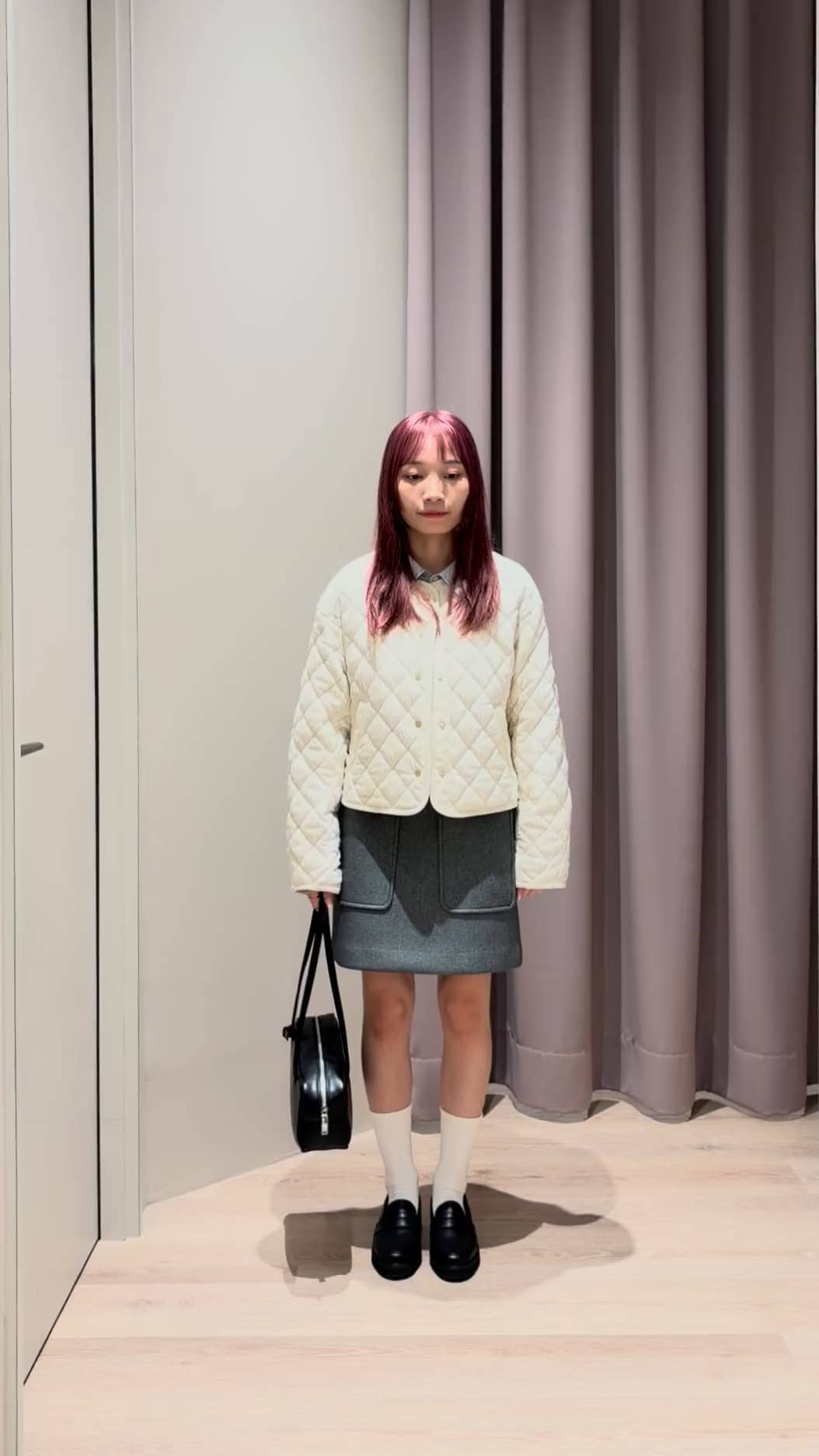 表面絨布的棉外套穿起來很舒服保暖,圓領的設計可以內搭襯衫讓領子露出來非常可愛~配上樂福鞋或是長靴都很適合!裙子的材質厚實,冬天比較冷時也可以內搭保暖褲襪,冬天也可以很可愛!