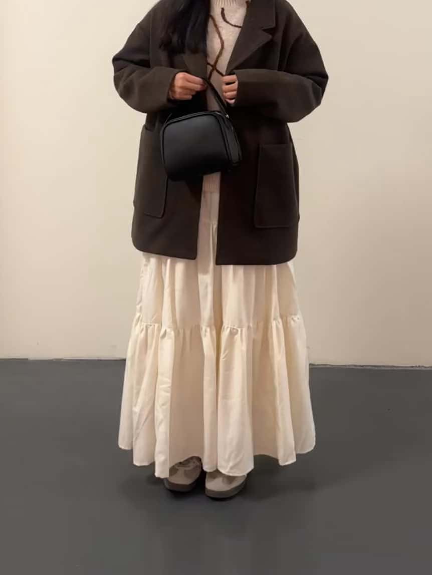 蛋糕裙中和了西裝短大衣的正式感,內搭緹花針織衫做點綴,氣質又帶點活潑的感覺,很適合聖誕節約會氛圍!!