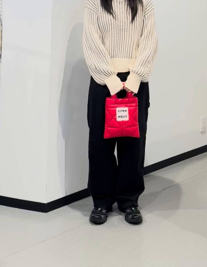 粗針織的立體感讓上身多一點份量,奶白色在冬天的光線裡很柔,乾淨不過度。下身以簡單的黑寬褲平衡比例,手上的亮紅小包成為低調造型裡的亮點