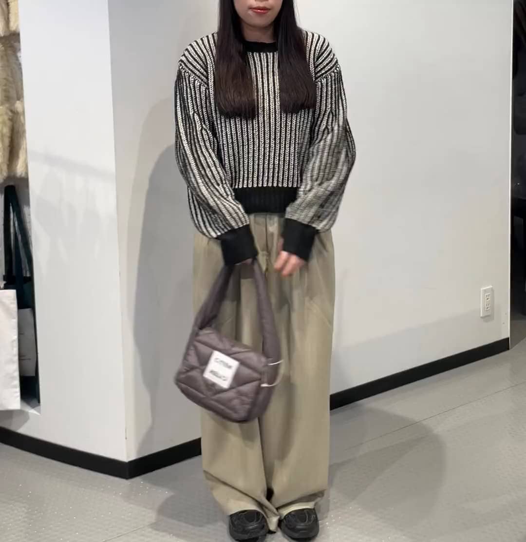 黑白編織感的寬鬆毛衣,輕鬆堆疊出秋冬的層次氛圍。下身的西裝褲垂墜版型讓整體更顯自在率性。