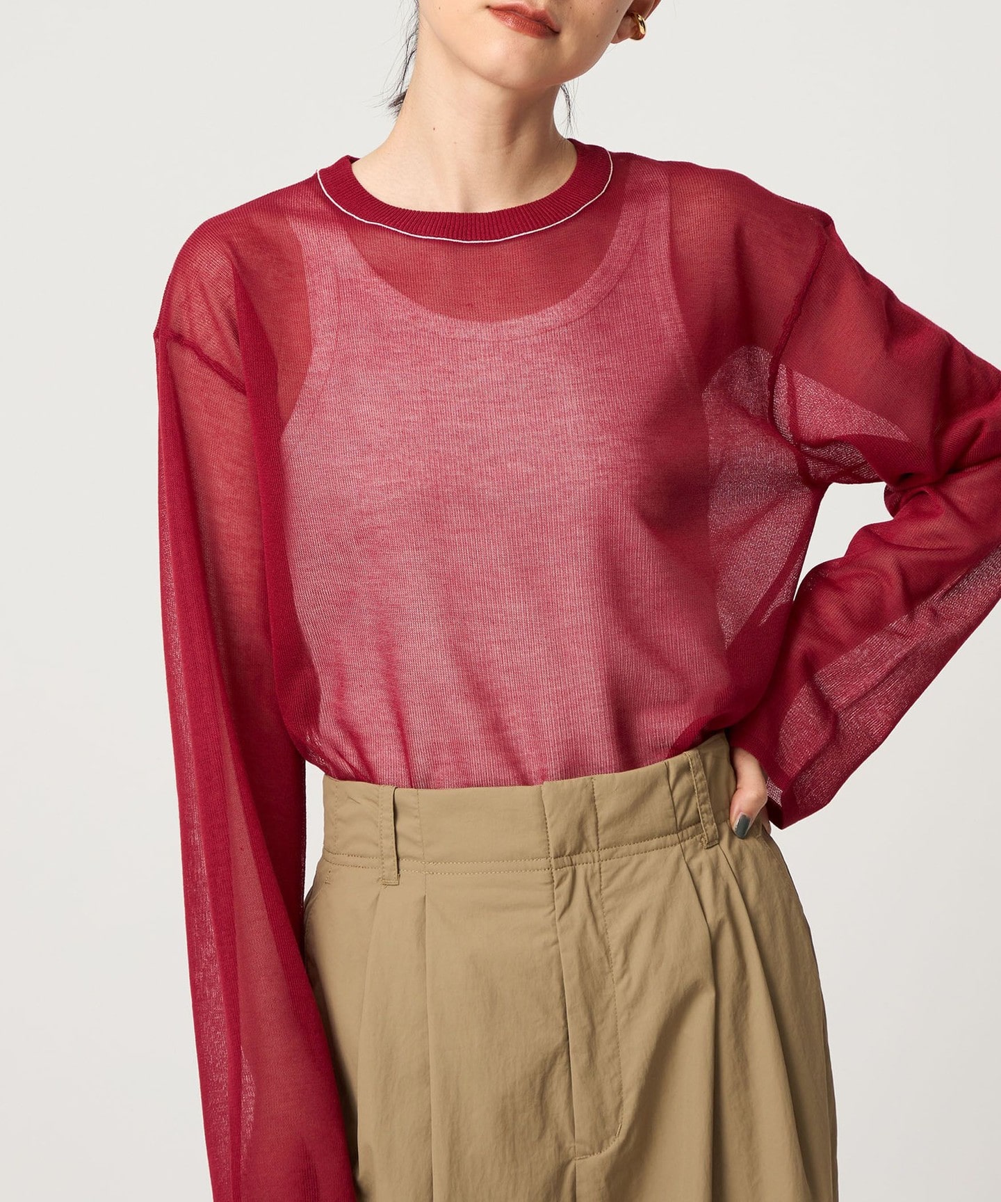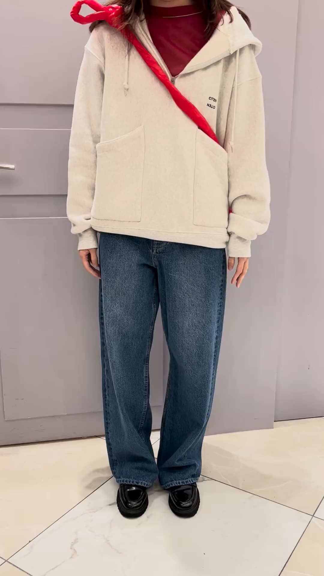 半開襟加上牛仔褲的穿搭簡約以外多了一點俐落感,內裏搭配紅色透膚增加一些疊穿層次~