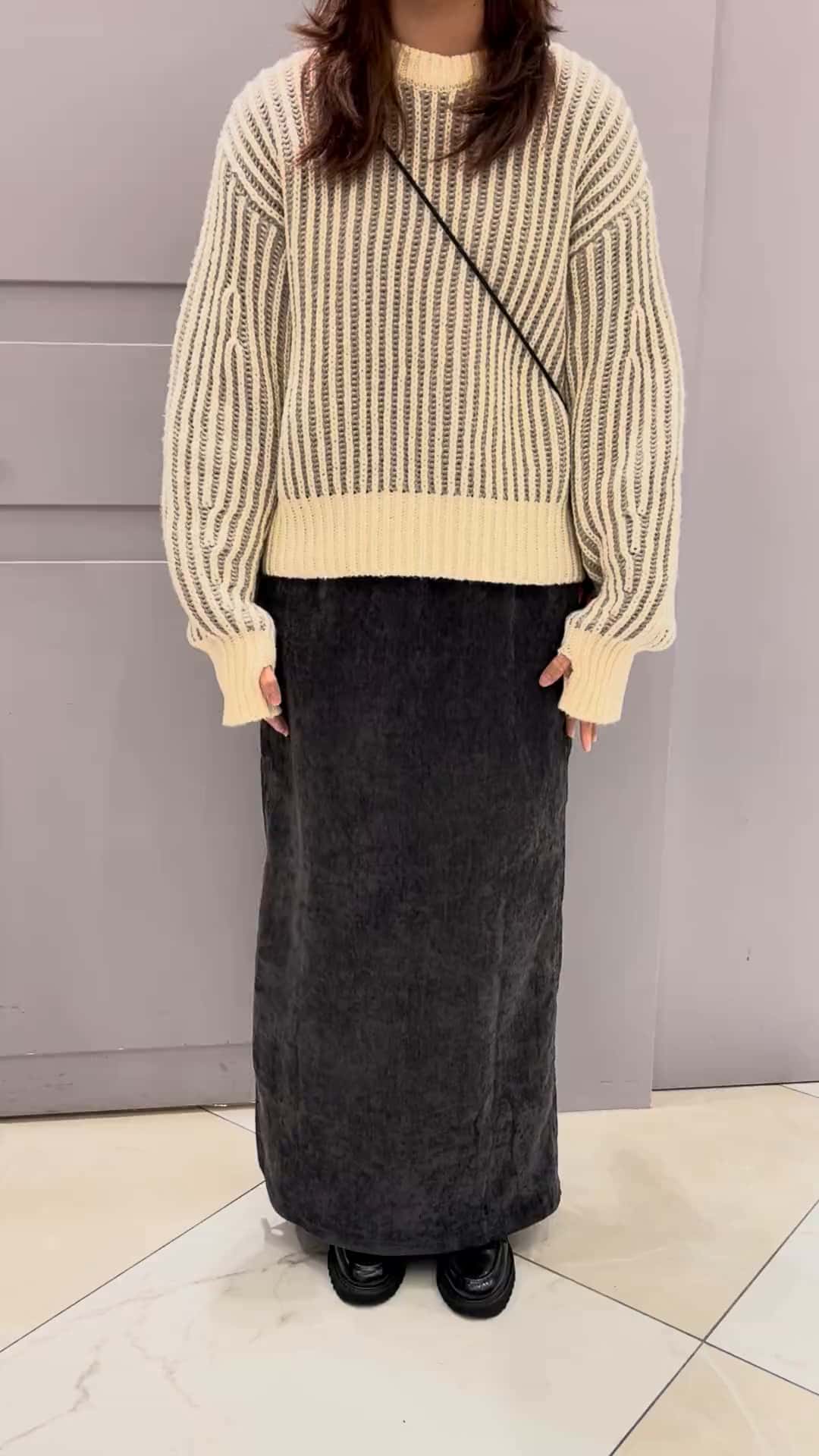 編織短板毛衣設計非常可愛還貼心的加上手指洞真的是冬天最好的穿搭單品~~下身仿天鵝絨長裙穿著上彈性及舒適度都很高是非常值得入手的下身!