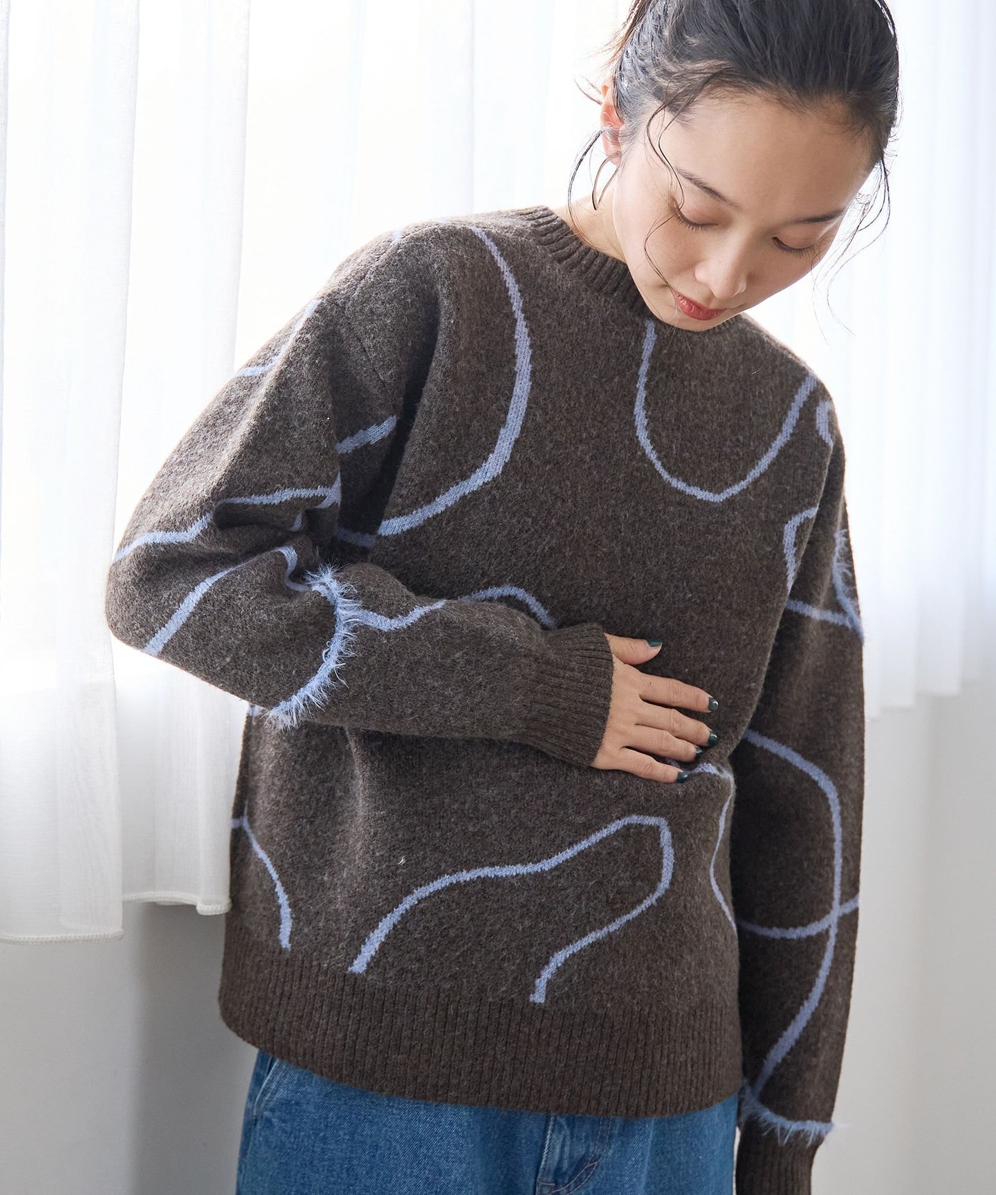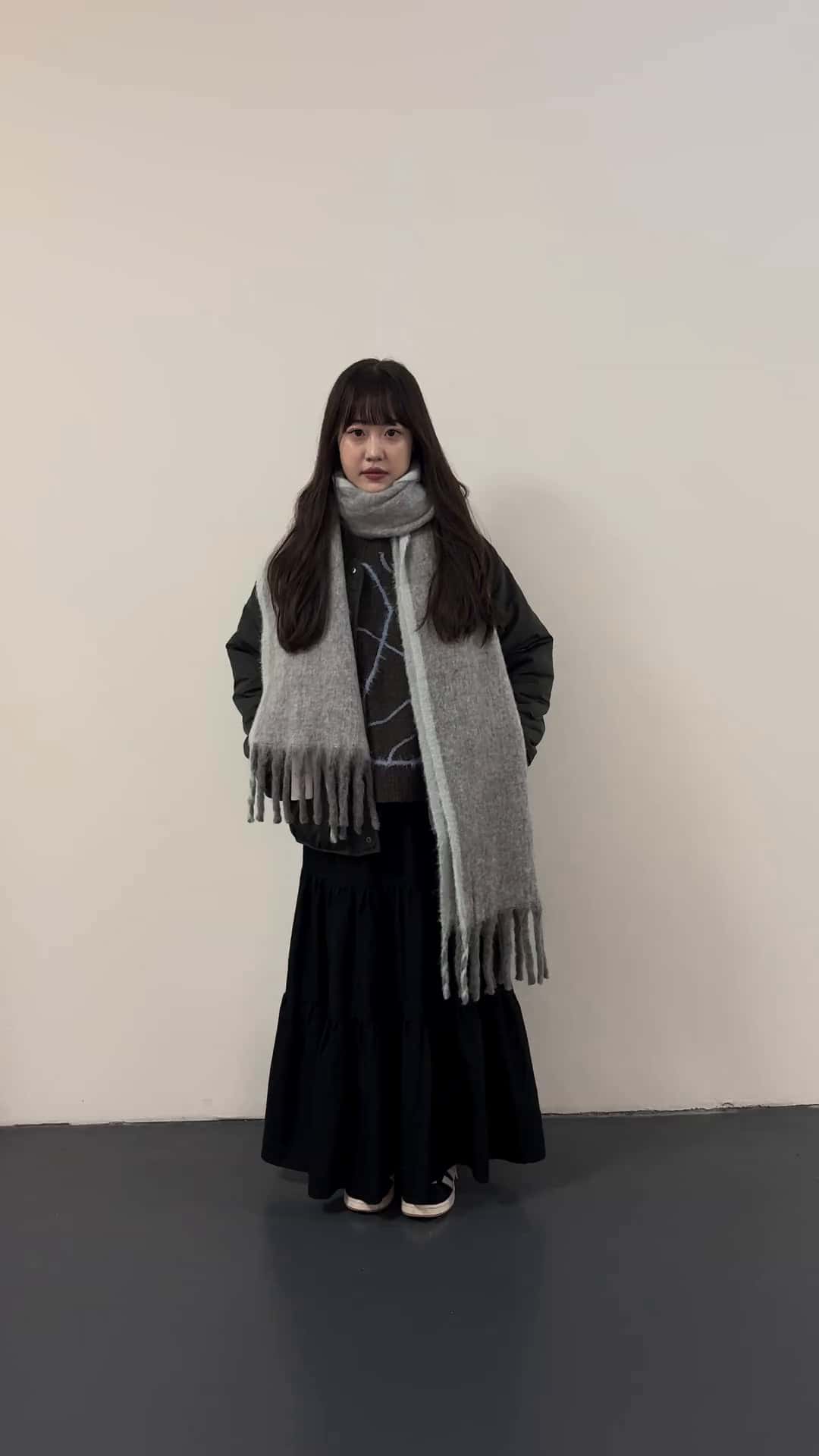 灰色系搭配,有藝術感的線條毛衣和黑色蛋糕裙增添可愛與氣質,雙面毛毛外套跟圍巾增添保暖與特色