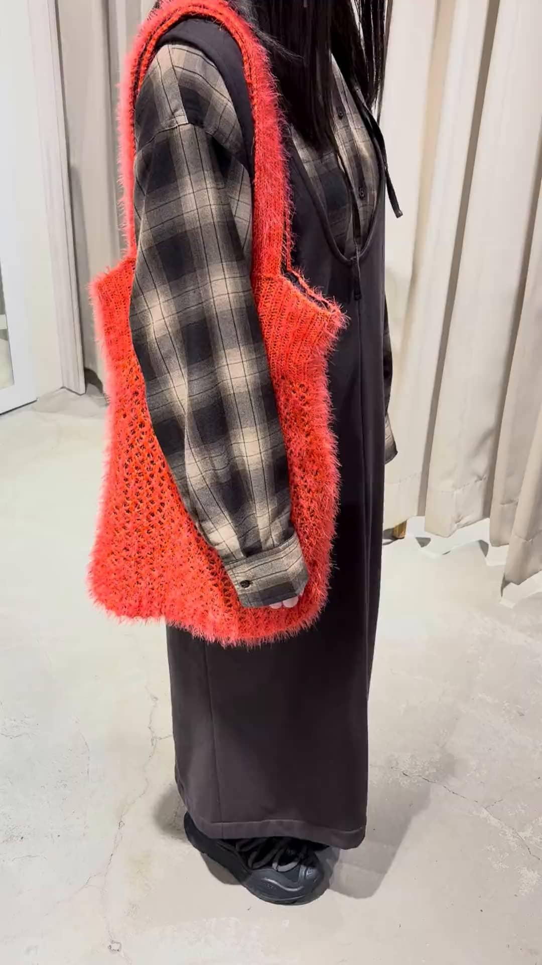 背心裙搭配格紋襯衫或毛衣都很合適!網眼針織包毛毛的超可愛😻⭐️