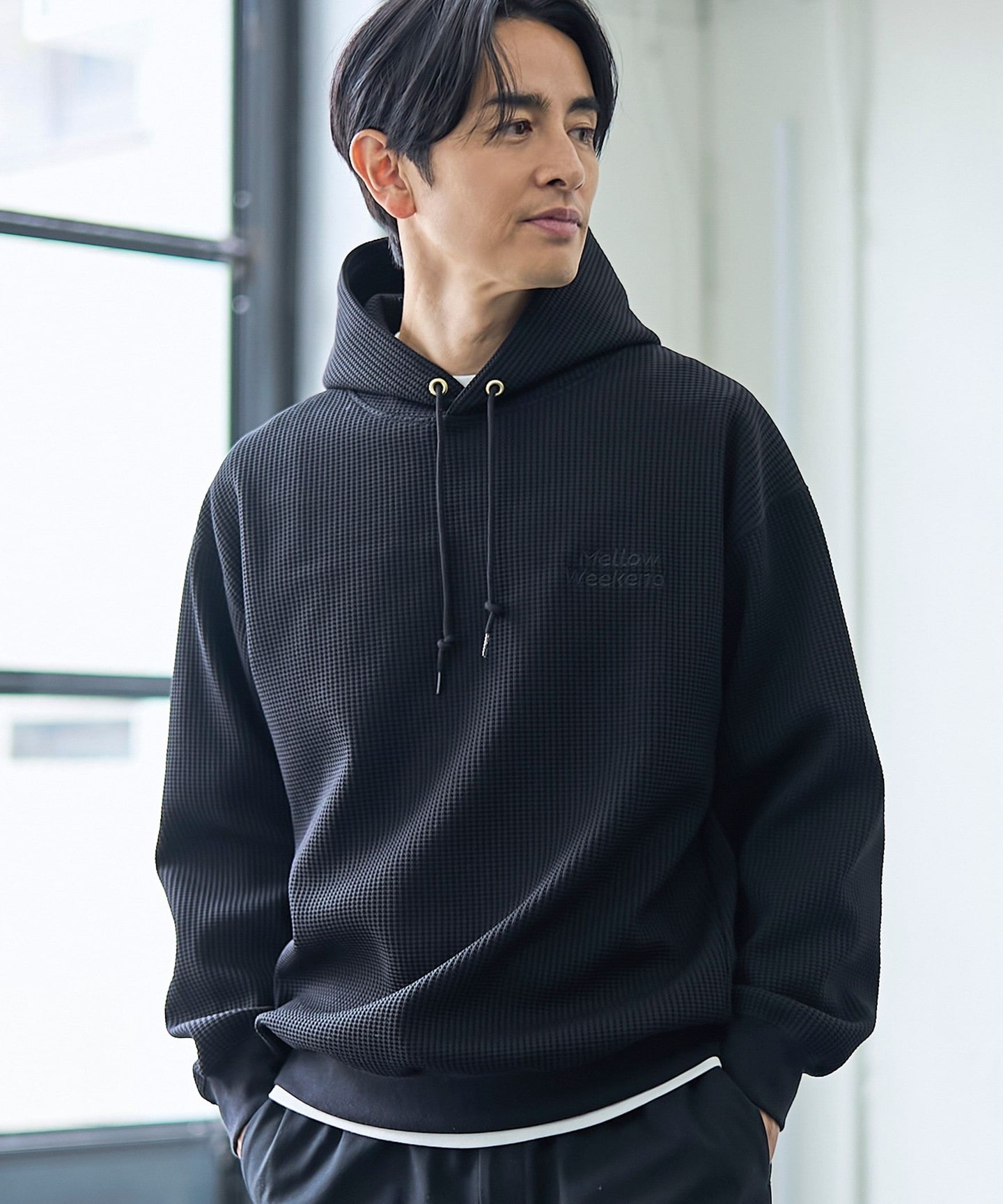 可單穿也能作為外套內搭的華夫格連帽上衣,觸感柔軟、帶有溫暖感。內裡搭配素色剪裁上衣進行層次穿搭,作為造型亮點。下身搭配寬版弧形褲。雖然是女款褲子,但我穿 L 號尺寸剛好,也推薦給正在尋找寬褲版型的男性。