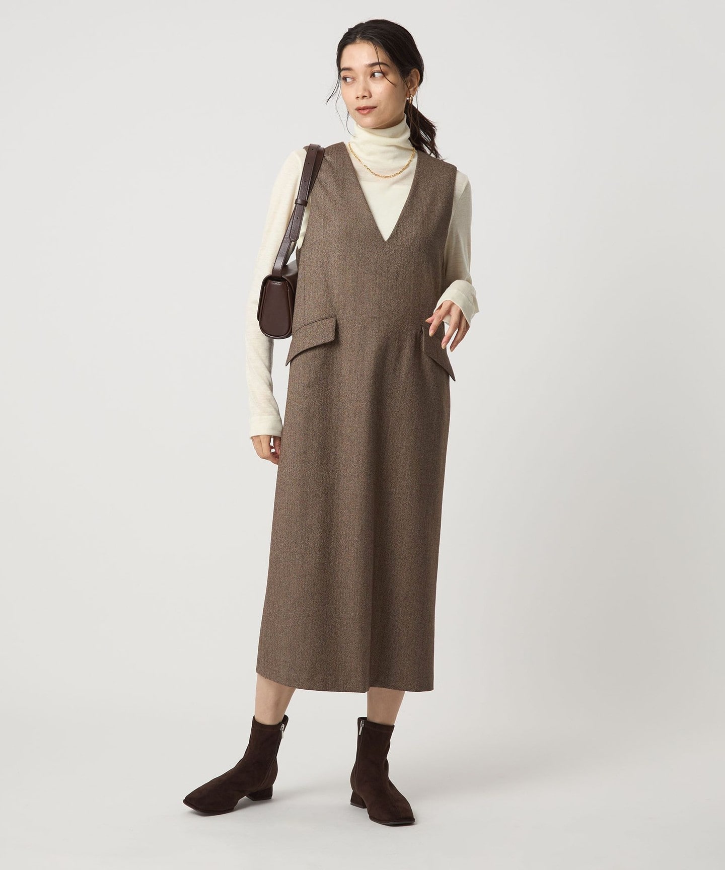 保暖的高領羊毛內搭,搭配 V 領連身裙,線條俐落不厚重,整體呈現溫暖又柔和的氣質感。