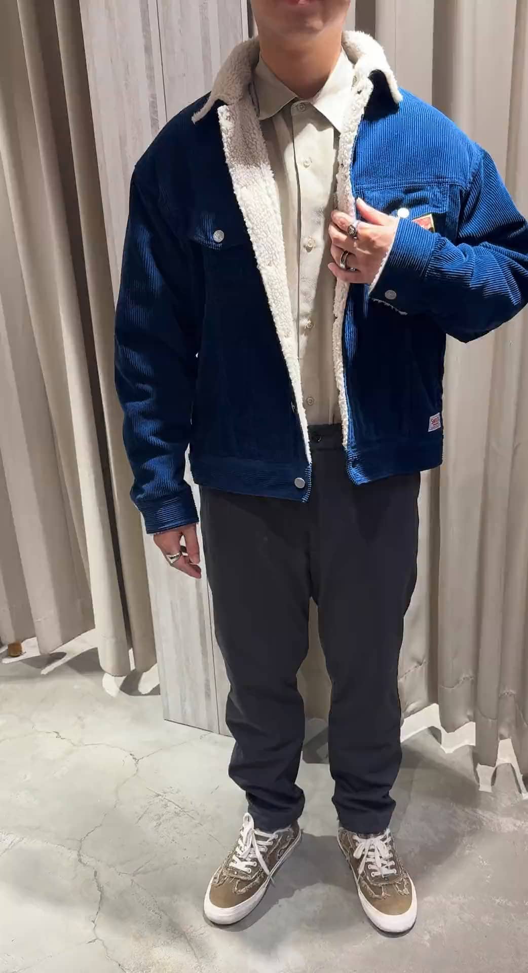 藍色燈芯絨外套搭配羊羔絨內裡,內層襯衫增加乾淨感,下身深色褲子讓整體平衡,保暖又有街頭感。