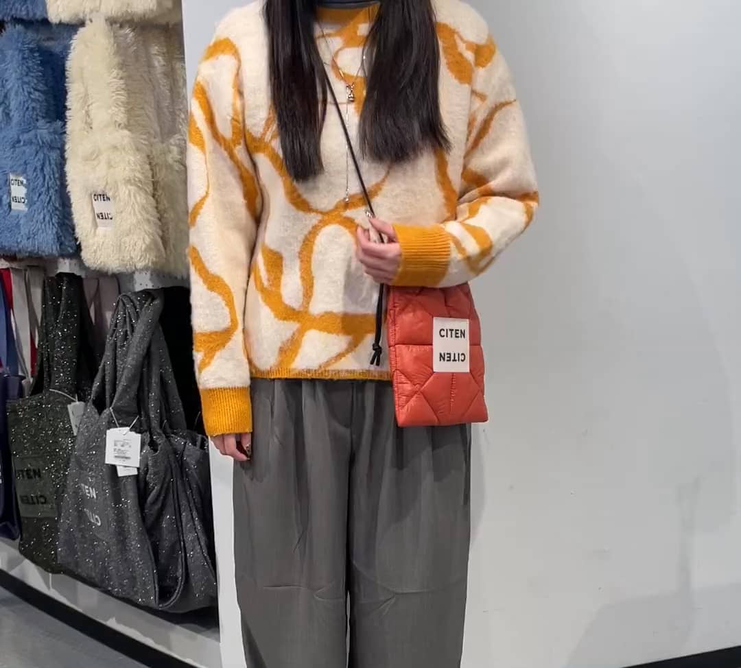 奶油底搭配橘黃色線條的針織毛衣,圖案不會太滿,好駕馭。顏色偏暖讓整體看起來氣色很好,袖口與下擺的撞色設計,增加一點層次感。