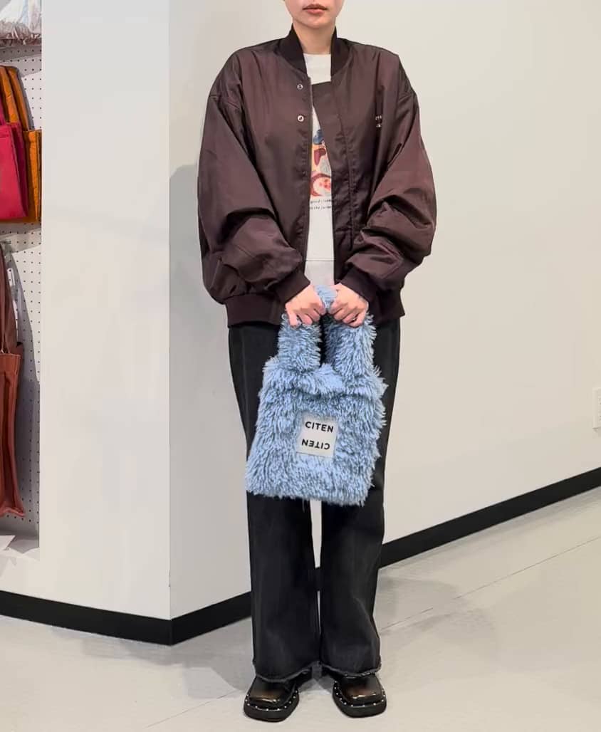 內搭選擇淺灰色上衣,利用明暗對比讓整體不會過於沉重。下身搭配深色牛仔褲,延續低彩度配色,藍色毛毛包用來做材質上的反差,