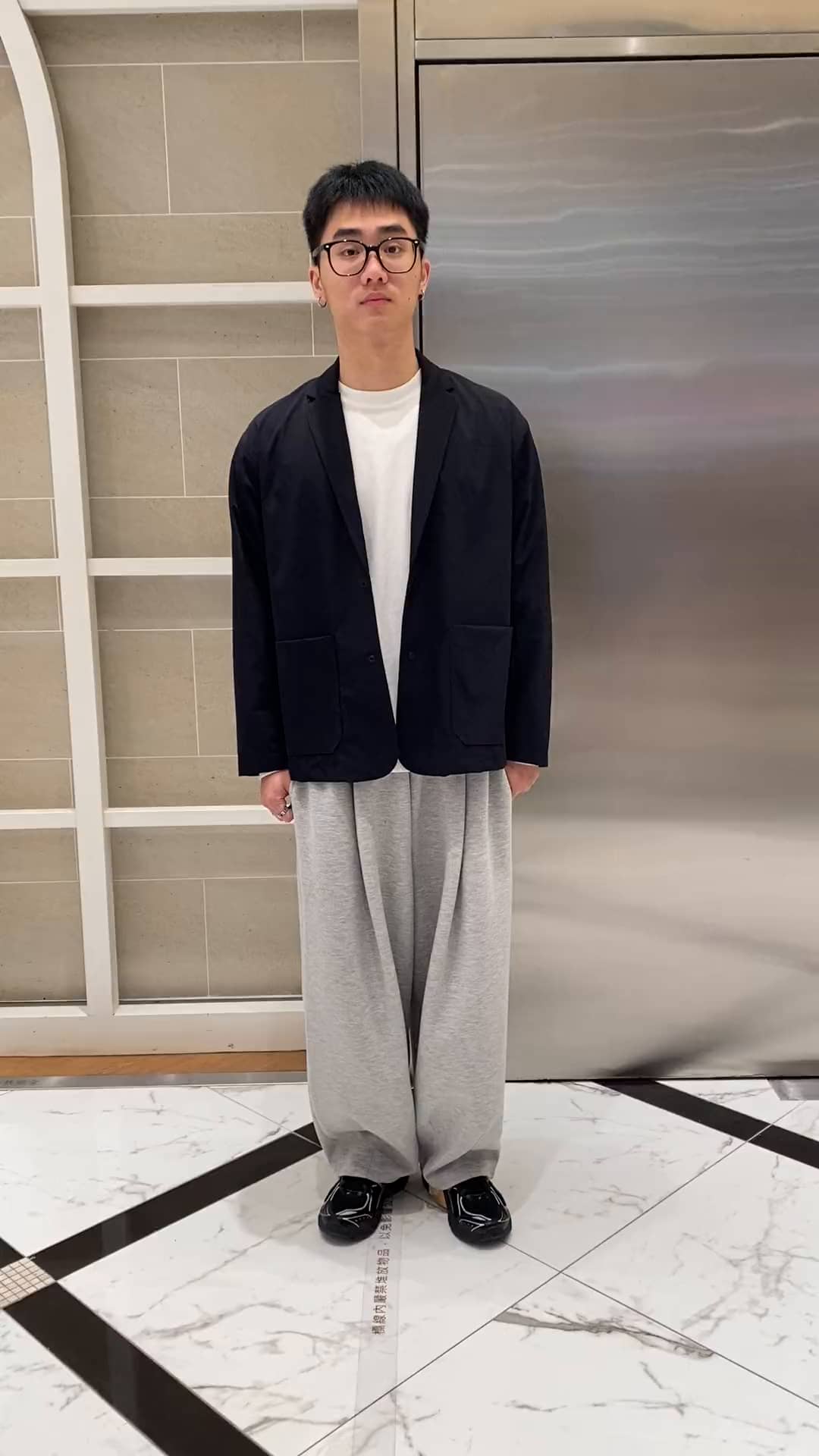 黑色休閒西裝外套搭配白T與灰色寬鬆長褲,再用黑色休閒鞋收尾,打造出 簡約俐落、帶點日系鬆弛感的黑白灰極簡穿搭。