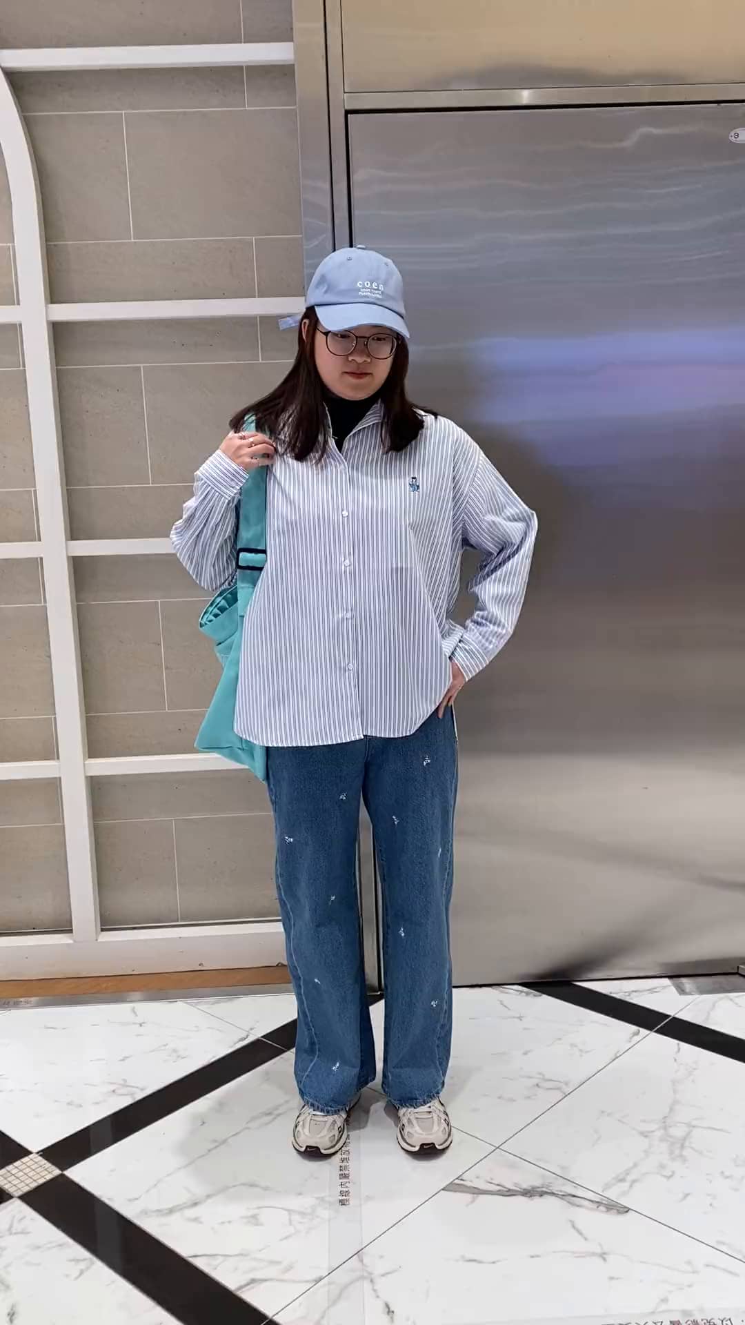 整身搭配以不同明度與材質的藍色為主軸,從淺藍色的棒球帽、細條紋襯衫,到中藍色的丹寧長褲,甚至是亮藍色的側背包。這種同色系的層次搭法讓整體視覺非常和諧,既有整潔感又不會顯得單調。