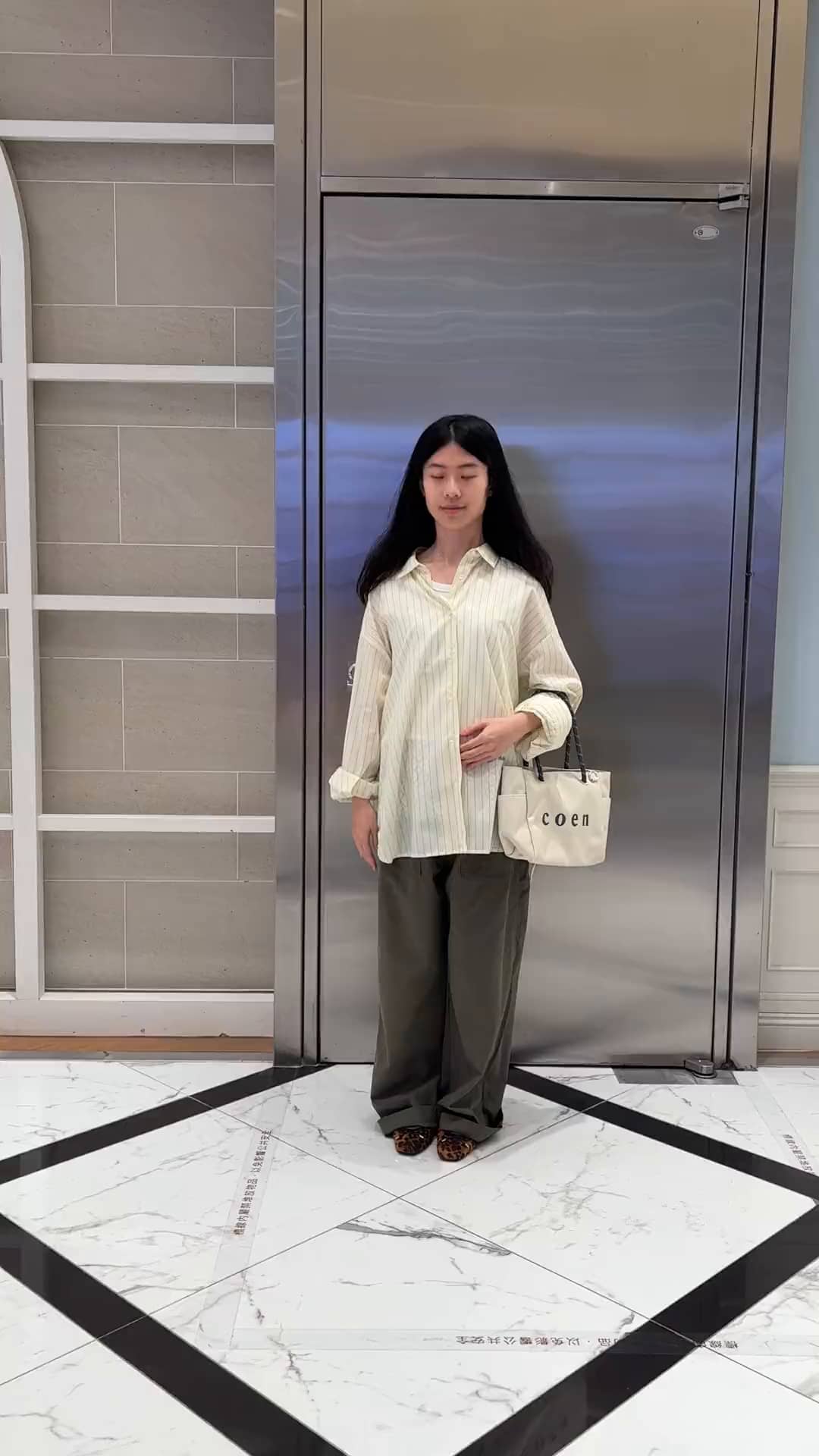 假日出遊休閒穿搭淡黃色條紋襯衫搭配相近色系包包完成一致性鞋子選用豹紋增加小小亮點