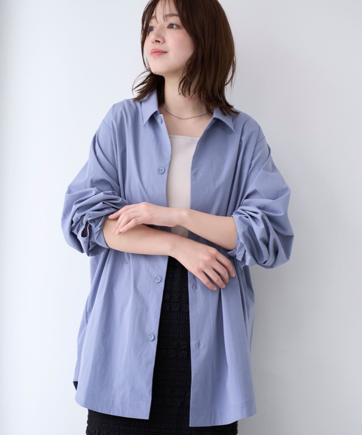 清爽機能襯衫的簡約穿搭!以清爽藍色襯衫為主角的簡約造型。這款襯衫具備彈性與防皺功能,不僅活動自如,長時間穿著也能輕鬆保持平整挺括。由於質地輕盈,隨意披在 T-shirt 外就能營造出層次均衡的視覺效果。