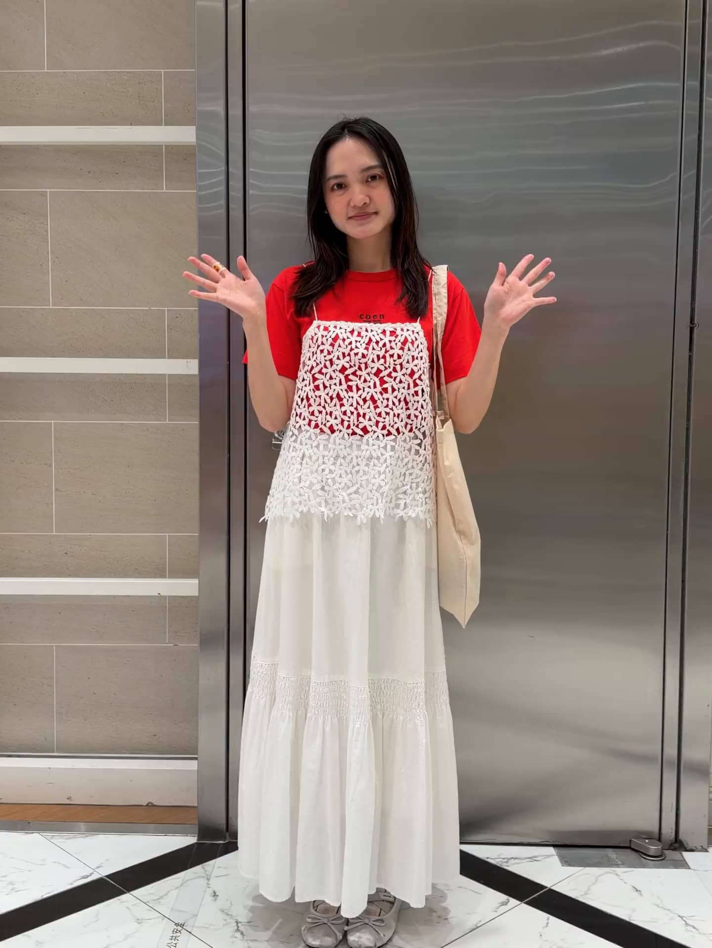紅色短袖盡現活力搭配鏤空背心與碎花長裙像少女一般有活力