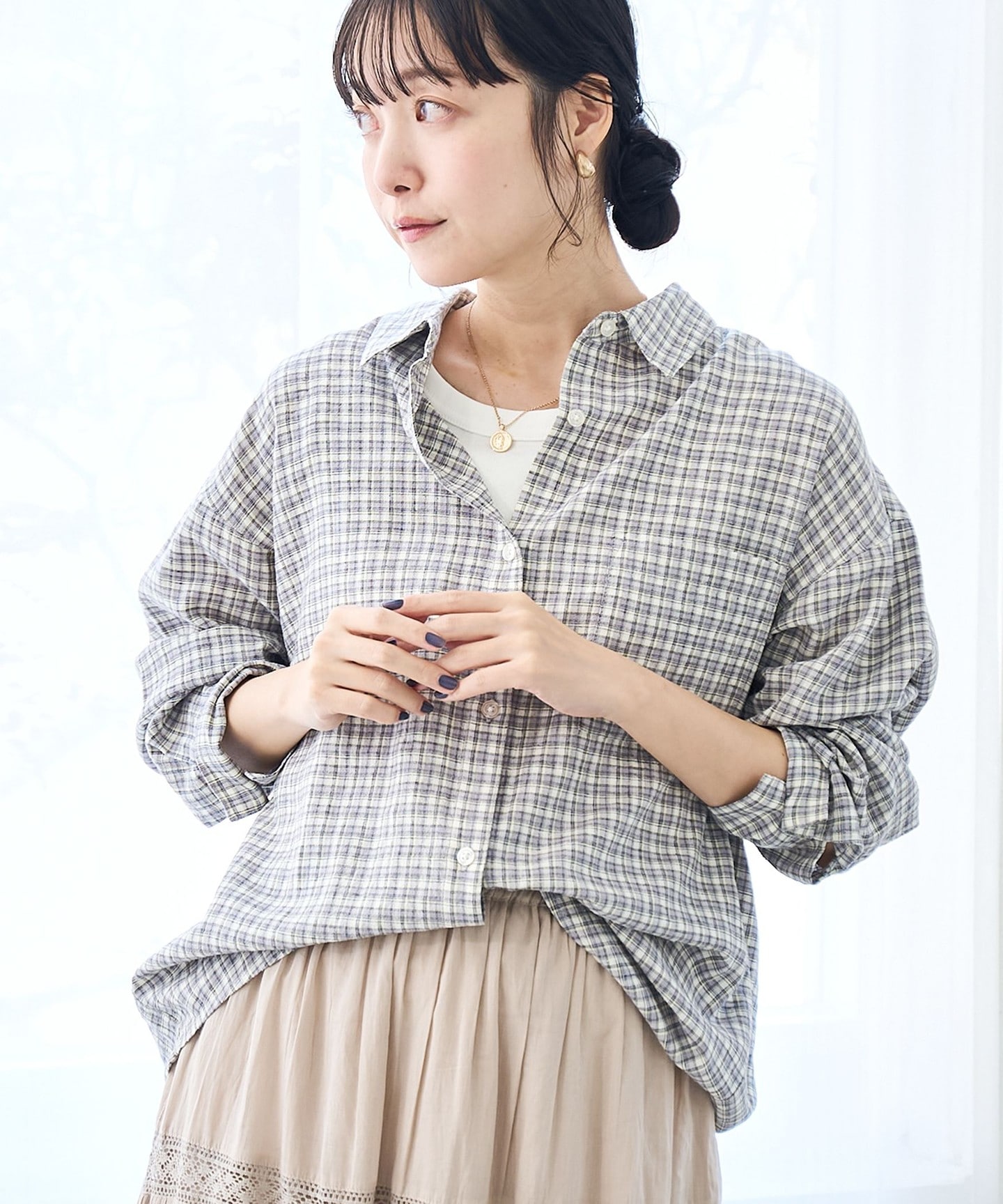 印花T繫上格紋襯衫,搭配出多層次穿搭。