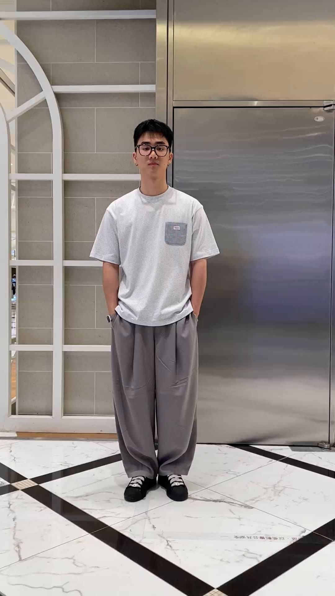 拼接的smith短袖使灰色短袖看起來不會過於無聊 顯得很有特色 搭配皺折設計的長褲顯得很有設計感