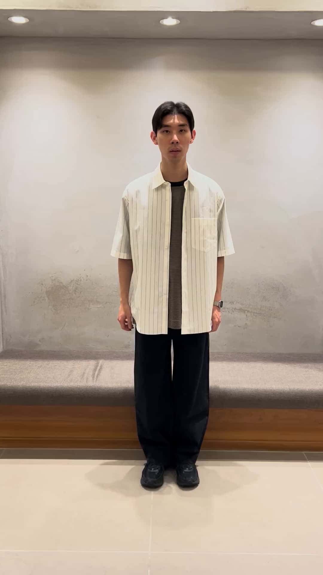 上身使用直條紋襯衫搭配內裡的橫條紋短袖,深淺對比卻不會突兀,反而能更吸引目光帶到整體,下身則使用牛仔寬褲,讓整體更加休閒與街頭。
