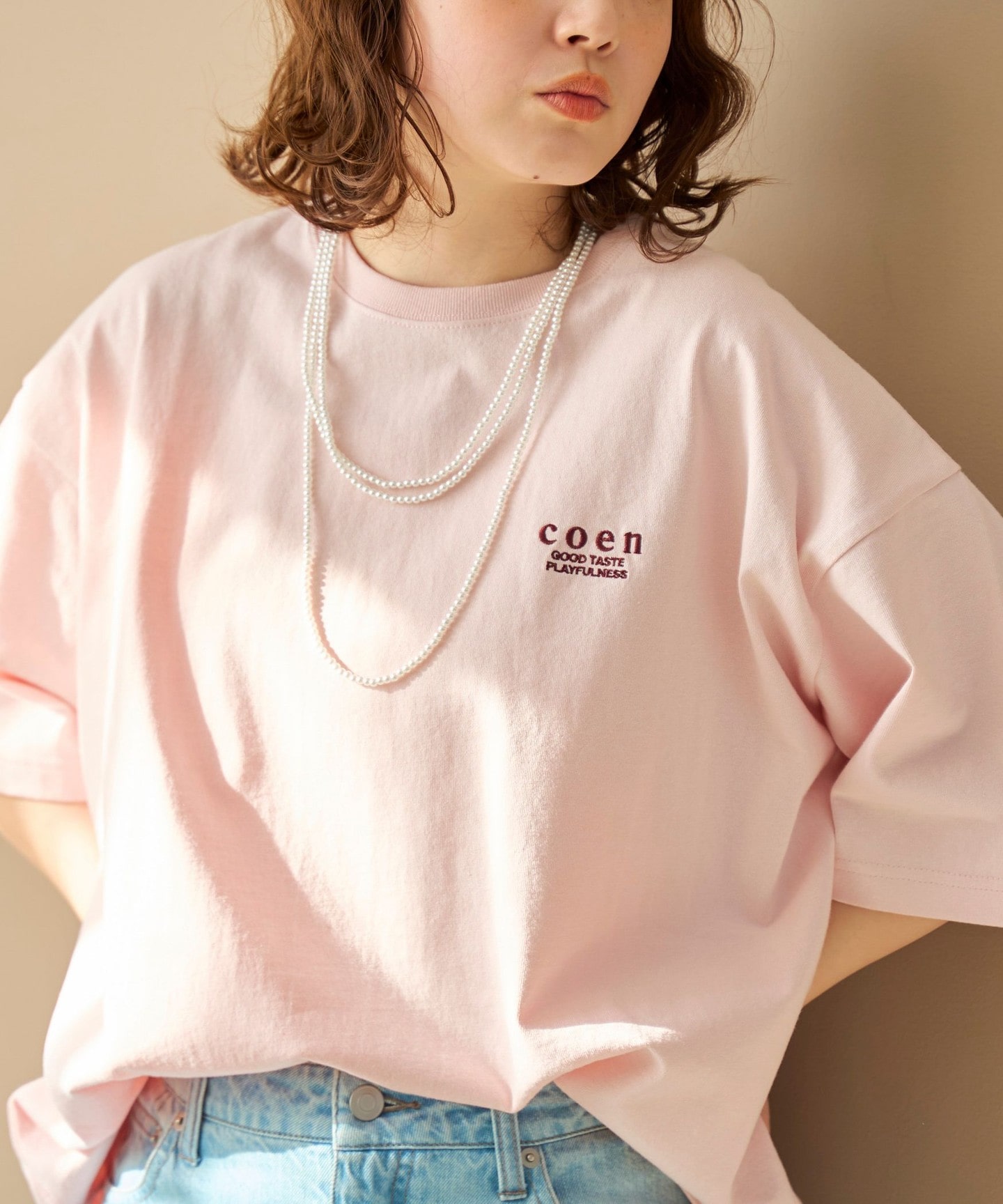 用粉色T當主角,讓整體有一點柔和感,再把條紋襯衫披在肩上,增加層次也讓造型更有重點~