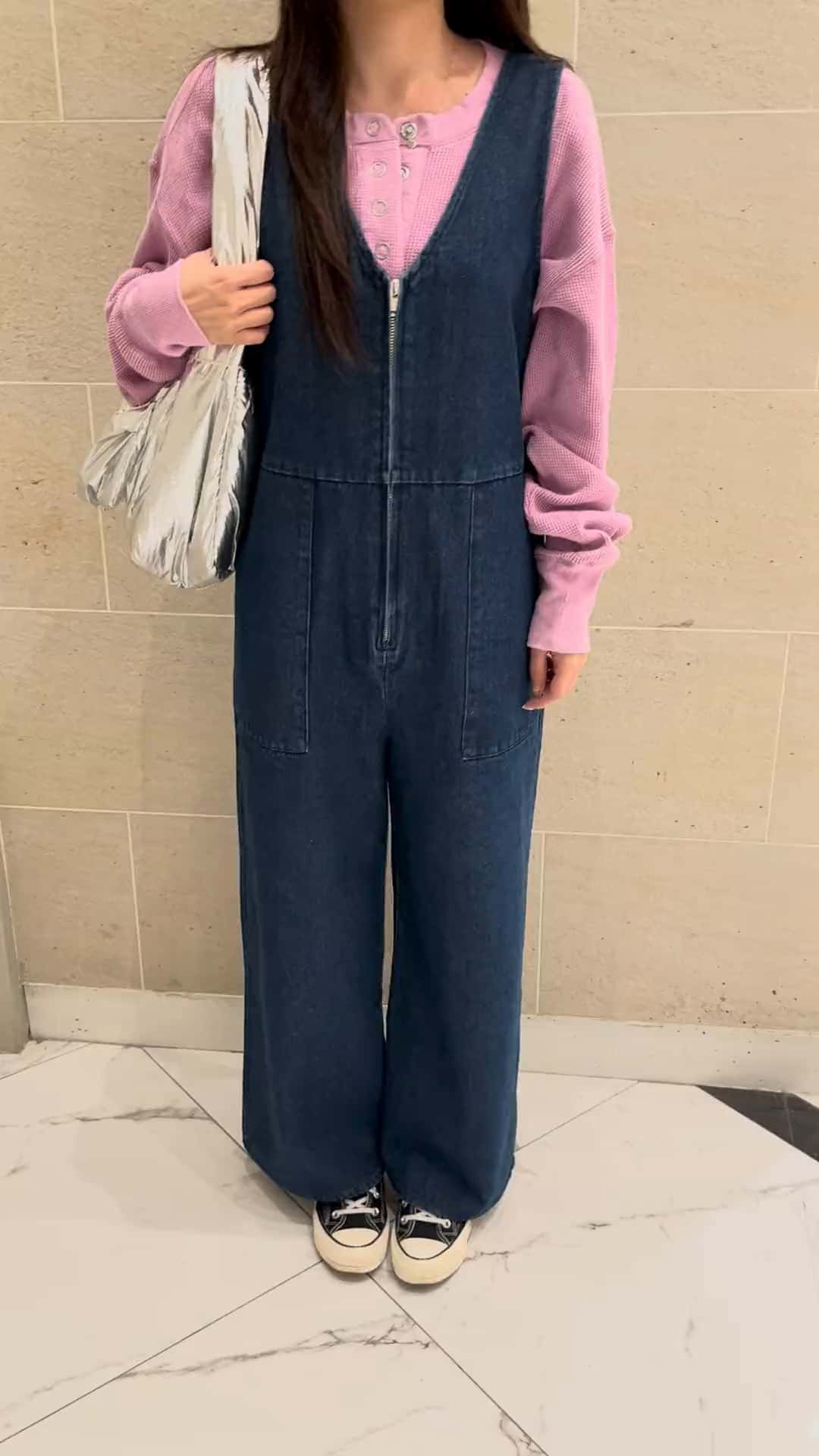 粉色內搭結合深藍牛仔V領連身褲,甜美中帶點率性,搭配銀色大包增加亮點,是可愛又有個性的日常休閒穿搭。