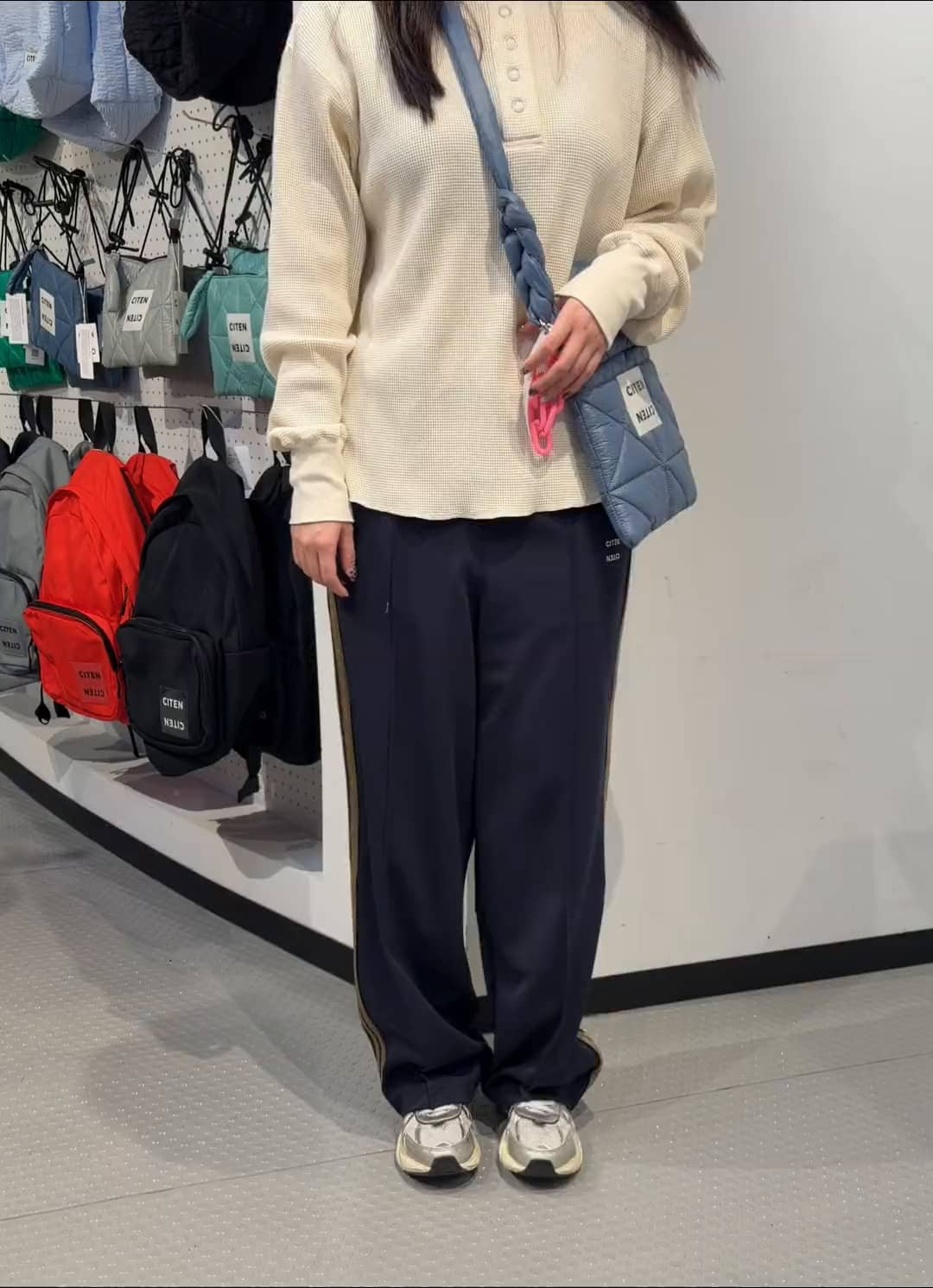 下身的側邊條紋設計,本來就很有運動感,但搭在寬版版型上,反而多了一點日系街頭的鬆弛感,整套非常舒適。